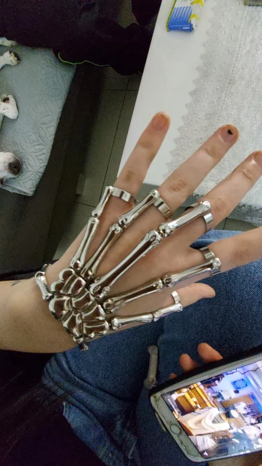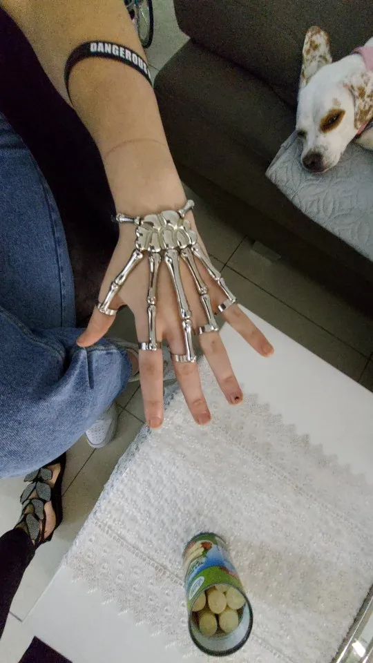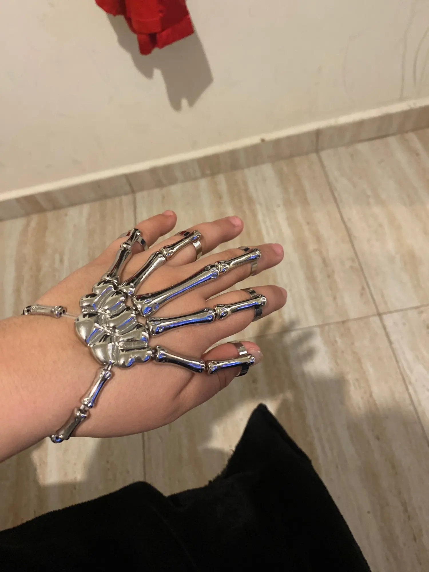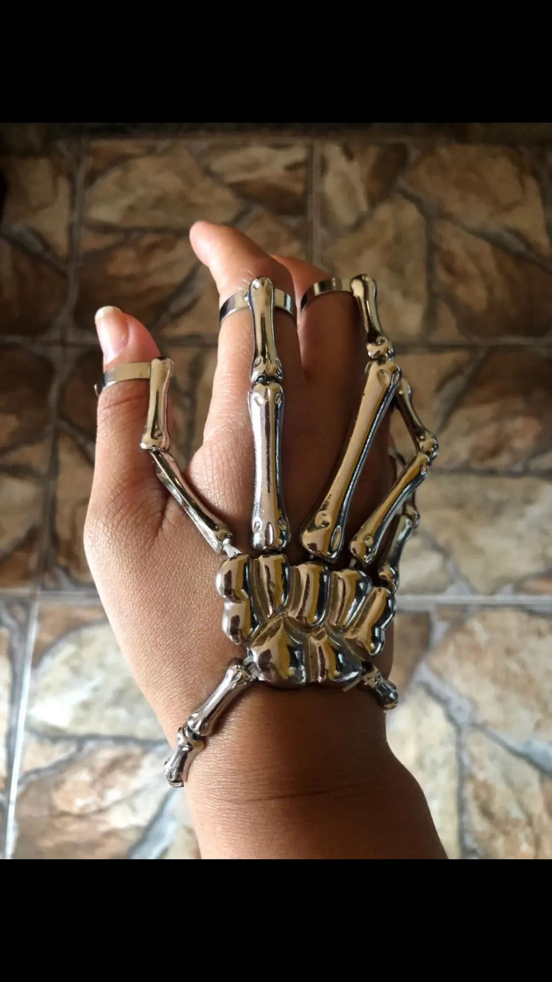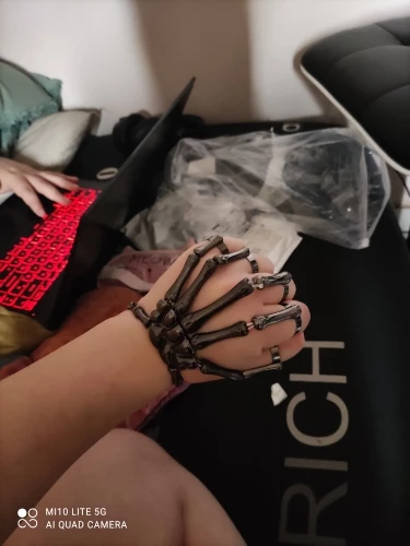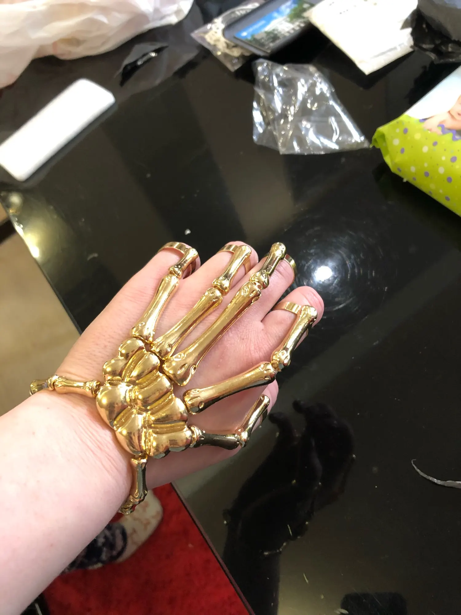 Доча счастлива! Страдает что в школу нельзя такие украшения одевать))) Весь скелет собран на резиночки, одевается несложно. Маловат для ладошки взрослого человека.