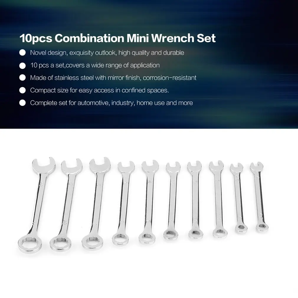 Особенность:1. Новый дизайн, изысканный внешний вид, высокое качество и долговечность2,10 шт. в наборе, охватывает широкий спектр применения3. Изготовлен из нержавеющей стали с зеркальным покрытием, устойчив к коррозии4. Компактный размер для легкого доступа в замкнутом пространстве.5. Полный набор для автомобилей, промышленности, домашнего использования и многого другогоСпецификация:Закрытый конец: 11, 10, 9, 8, 7, 6, 6, 5,5, 4,5, 4 ммОткрытый конец: 10, 9, 8, 7, 6, 5,5, 5, 5, 4, 4,5 ммРазмер товара: 100x19x5 ммВес изделия: 18 гИнформация посылка:Посылка: 192x86x10 мм/7,56x3,39x0,39 дюймаВес посылка: 126 г/4,44 унцииПолиэтиленопосылка пакетПосылка входит:1 x набор гаечных ключей