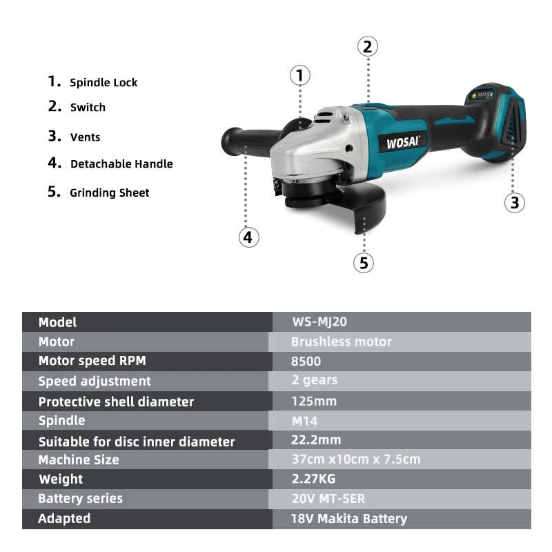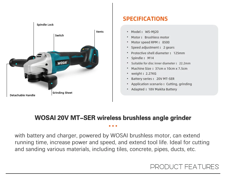 Угловая шлифовальная машина WOSAI, 20 в, бесколлекторная, литий-ионный