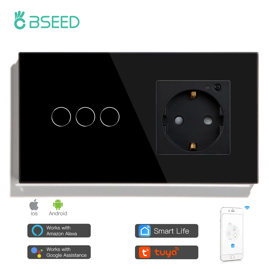 BSEED 3 Gang умный сенсорный светильник переключатель с Европейская Сетевая розетка; Цвет: белый, черный, золотистый стены Сенсор переключатель из хрустального стекла Панель работать с Tuya
