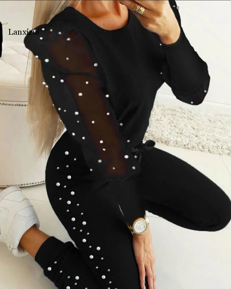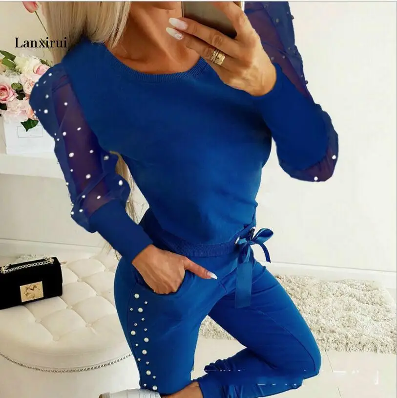 Женский комплект из 2 предметов, однотонный Повседневный пуловер с бусинами и круглым вырезом, длинные брюки с высокой талией