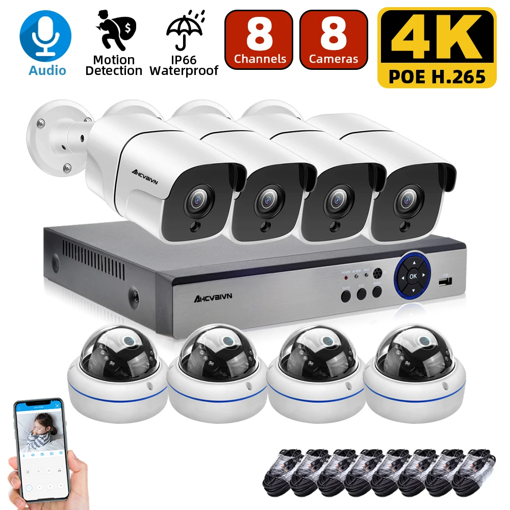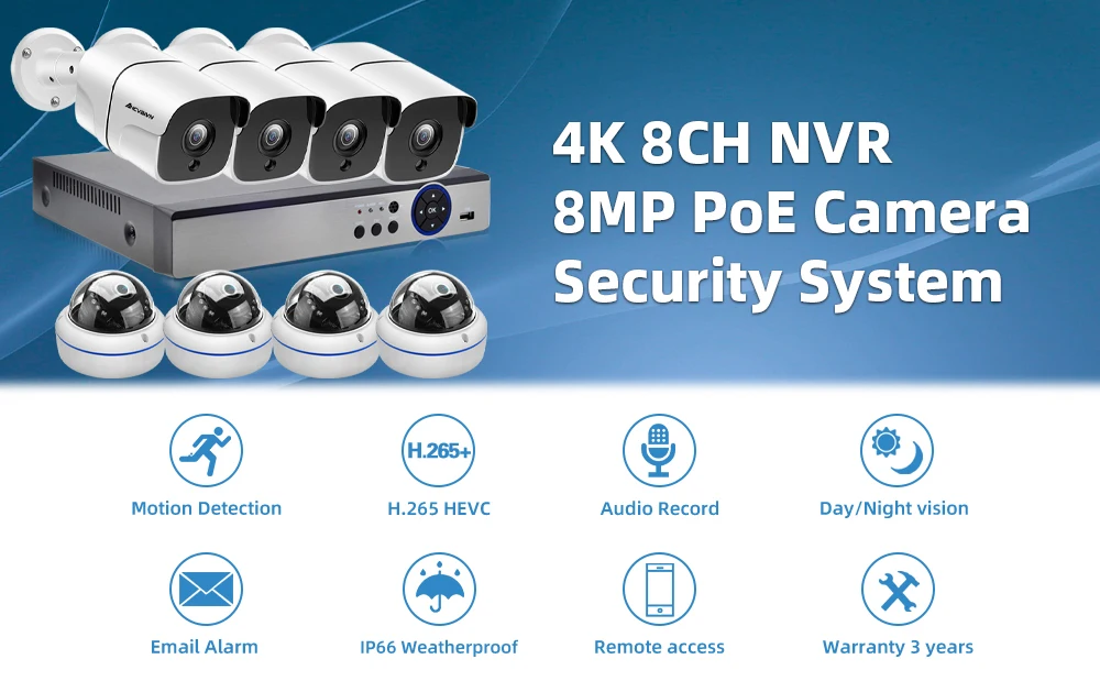 1. Все наши NVR и камеры являются реальными H.265 4K 8MP, NVR может поддерживать 8MP и 4K max, вы можете подключить 720p,1080p,3mp,4mp ,5mp, камеры 8mp & 4k с нашим POE NVR;2. Наш NVR поддерживает распознавание лиц, умное воспроизведение лица, обеспечивает ультра высокое разрешение видео наблюдения, обеспечивая максимальную детализацию и четкость в наличии;3. Наш NVR и камеры поддерживают расширенное H.265 Сжатие видео, питание через Ethernet, подключи и работай, прост в использовании;4. Все камеры встроены в микрофон, поддерживают аудиозапись, поддерживают режим ночного видения Ultra HD;5. Все камеры имеют металлический материал, IP66 водонепроницаемый, подходит для внутреннего и наружного использования, надежная Домашняя безопасность;6. Поддержка обнаружения движения, оповещения по электронной почте, воспроизведения видео и многоязычности;7. Поддержка Android,Iphone,Ipad,PC,VMS,P2P view;8. Удаленный доступ в любом месте, в любое время;
