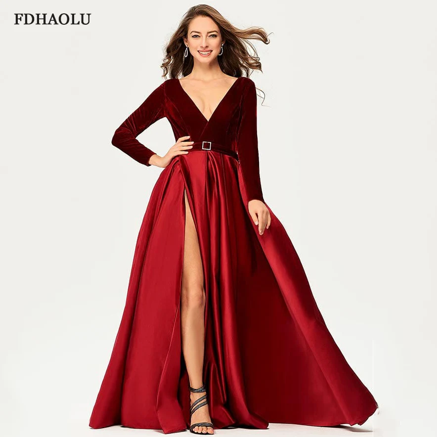 Длинные вечерние платья FDHAOLU AE126 бордового цвета с V-образным вырезом, велюровое атласное официальное платье с высоким разрезом, элегантные вечерние платья с длинным рукавом