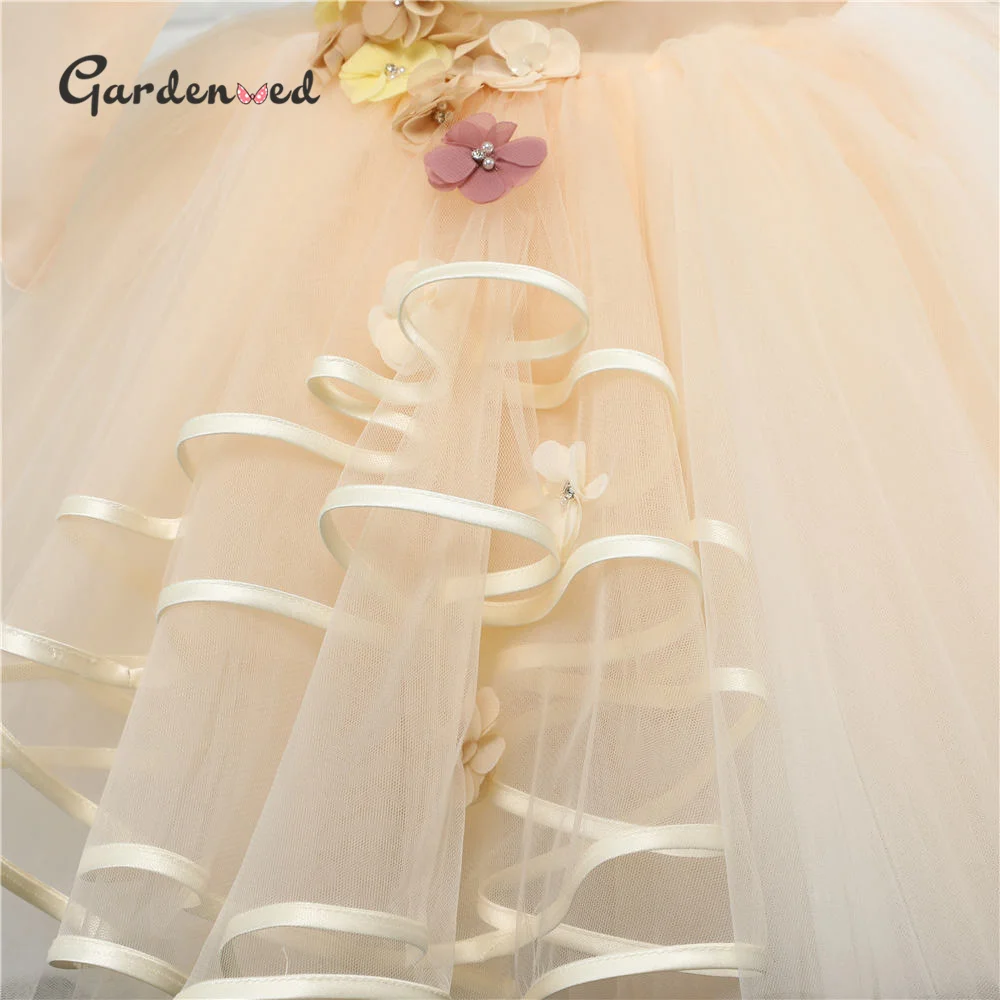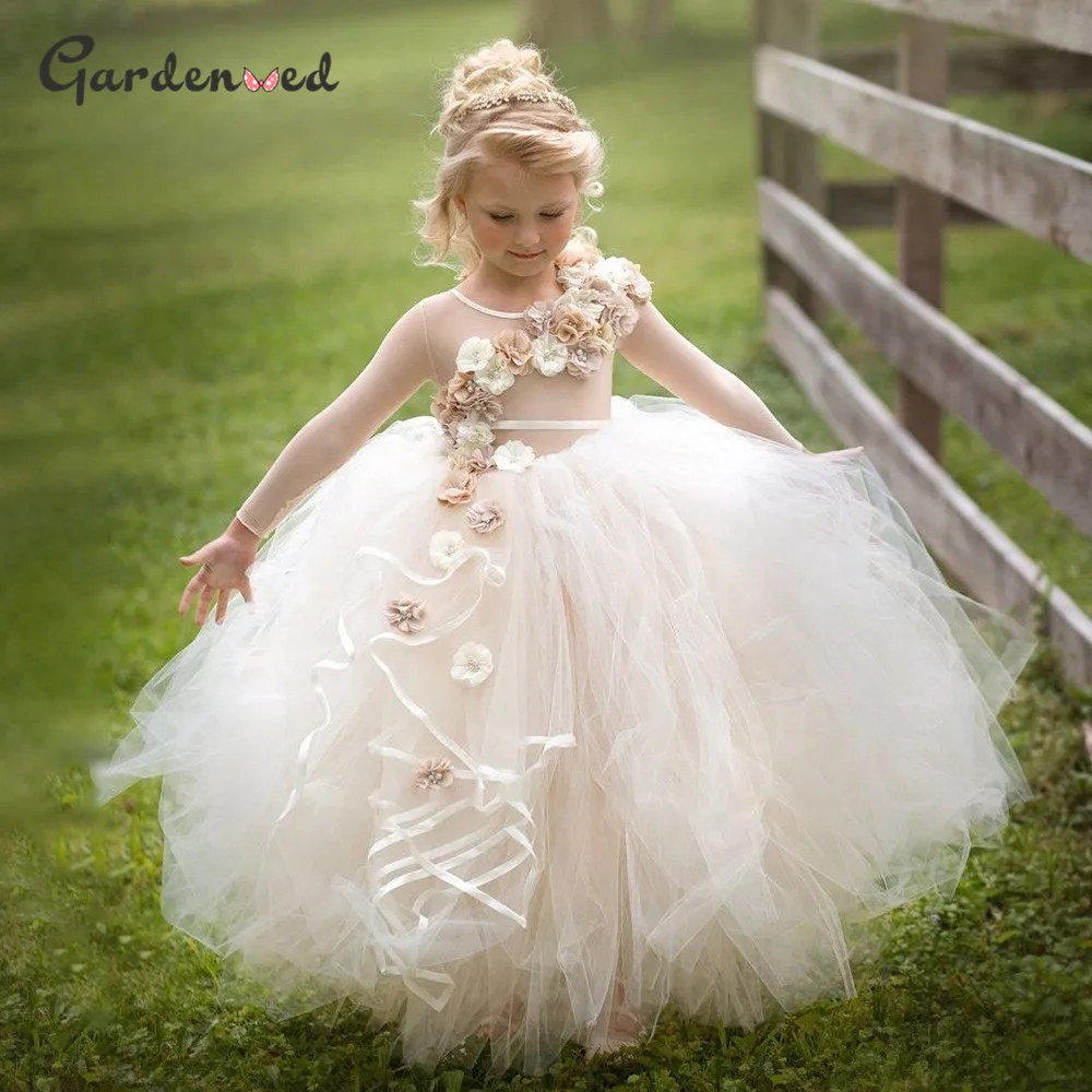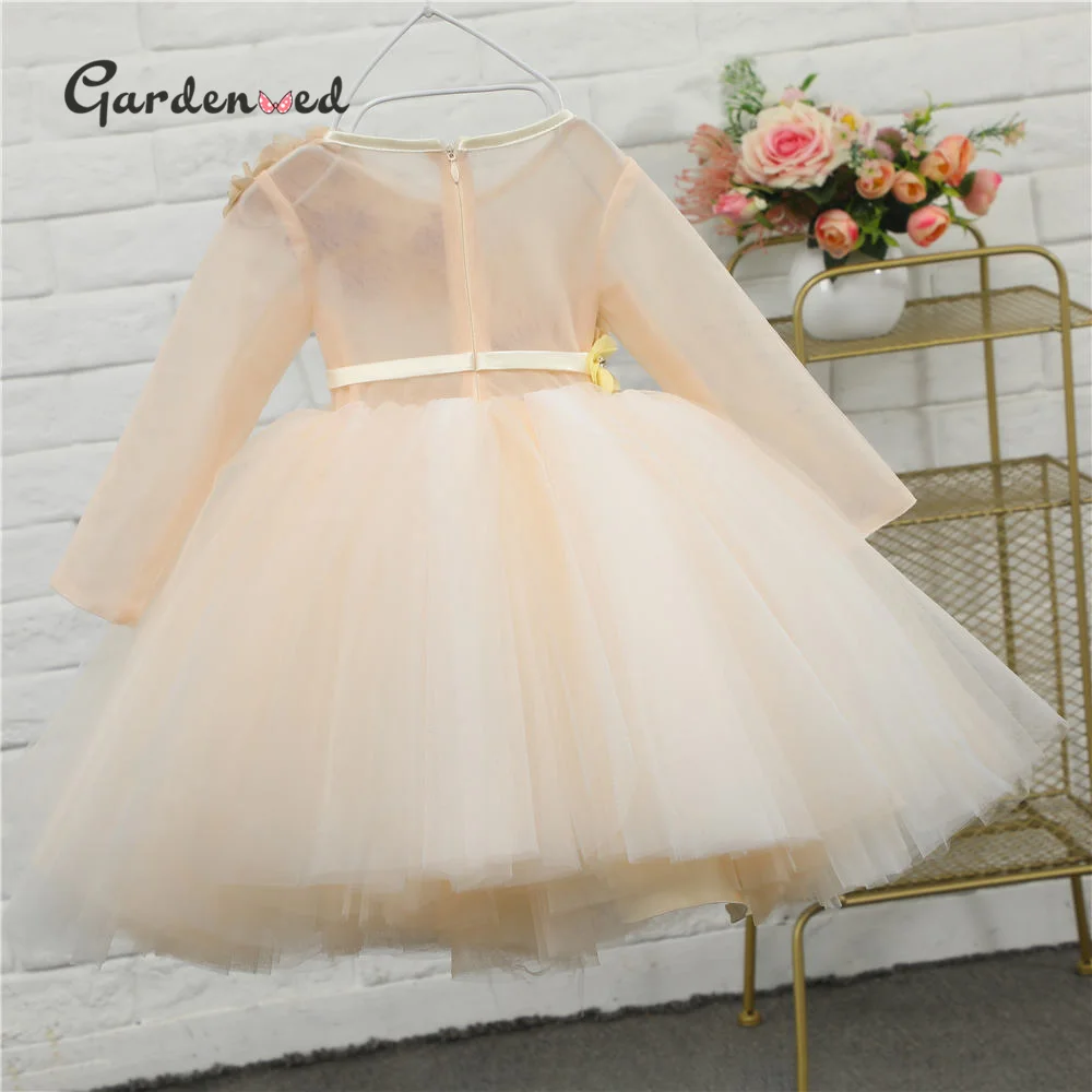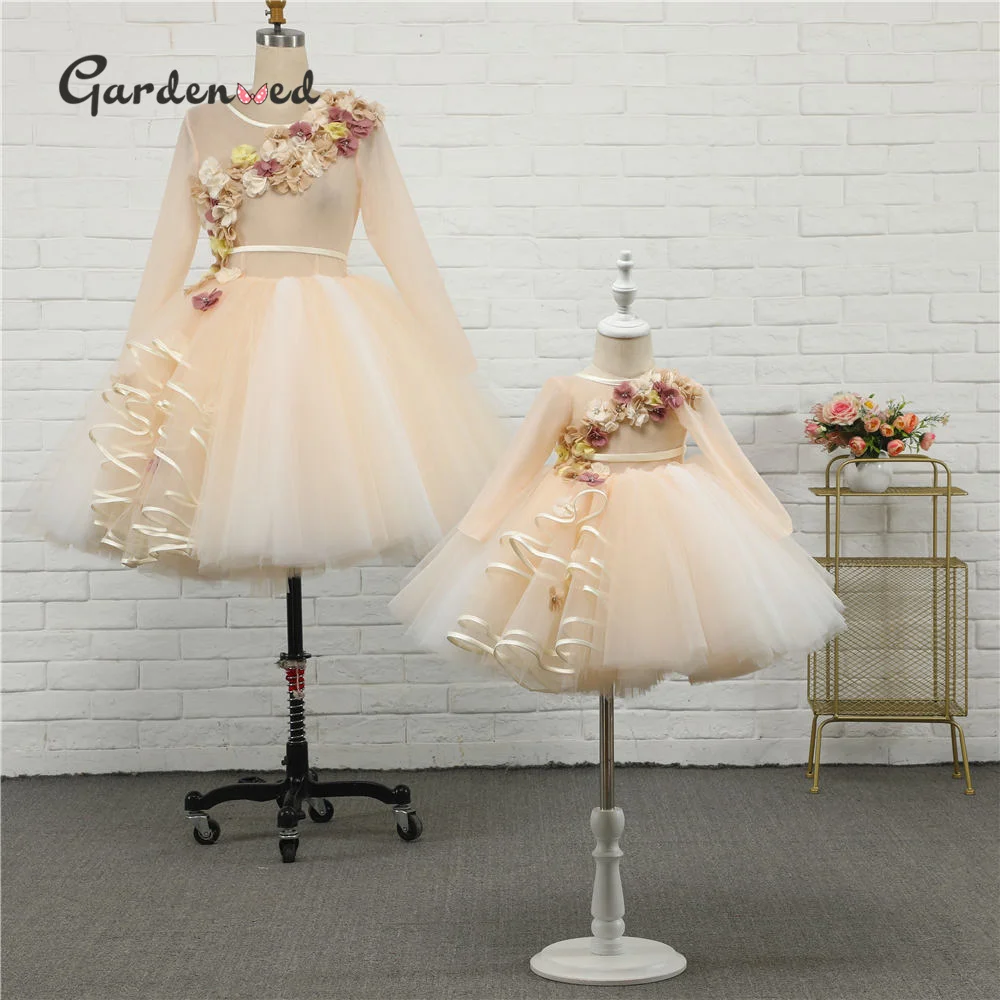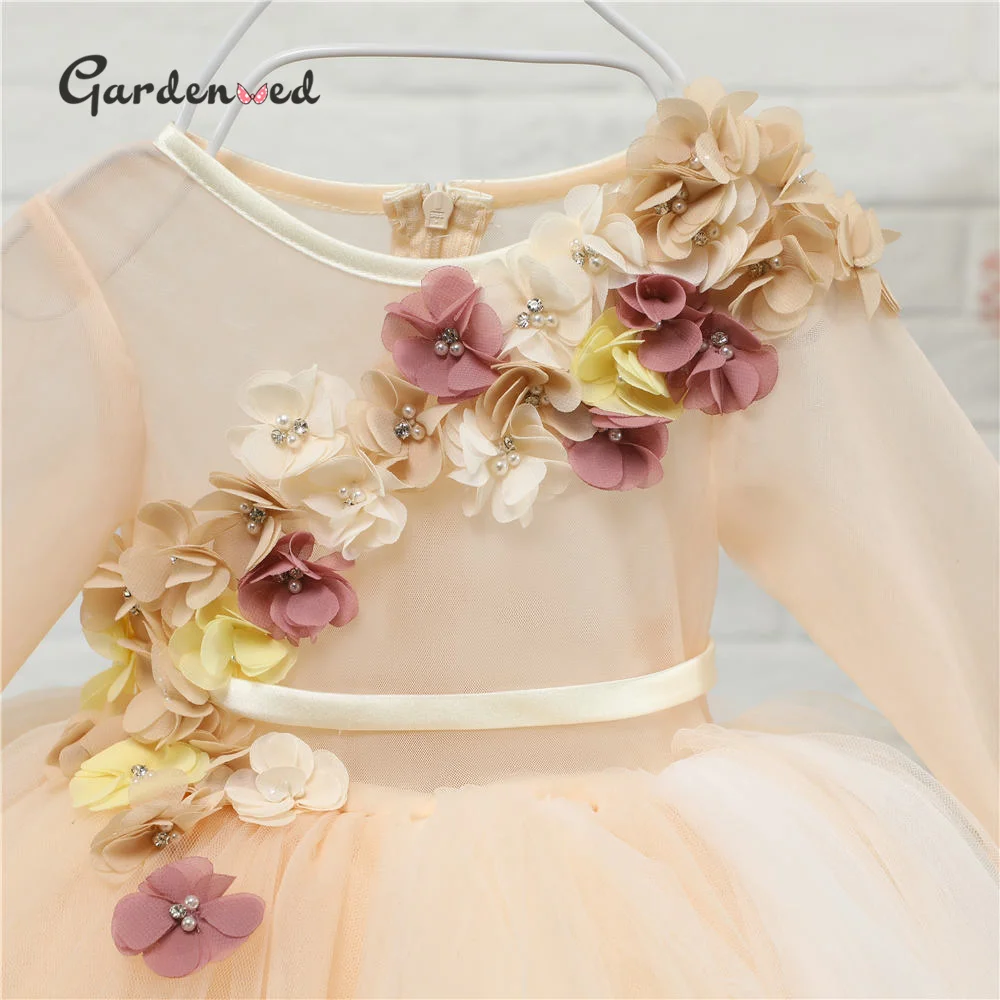Платье с длинным рукавом для девочки, Пышное Платье с 3D цветами, иллюзионное платье на день рождения, элегантное платье для девочки на свадьбу, вечеринку, 2020