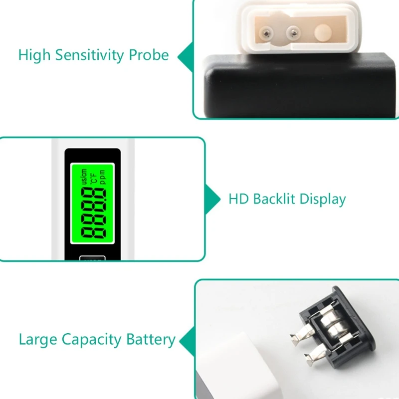 Большой ЖК-дисплей с подсветкой для удобного чтения, если ppm<40, цвет подсветки зеленый, означает питьевую воду. Если ppm≥ 40, красный цвет с подсветкой означает, что это не идеальная питьевая вода, если ppm слишком высока, не рекомендуется пить.