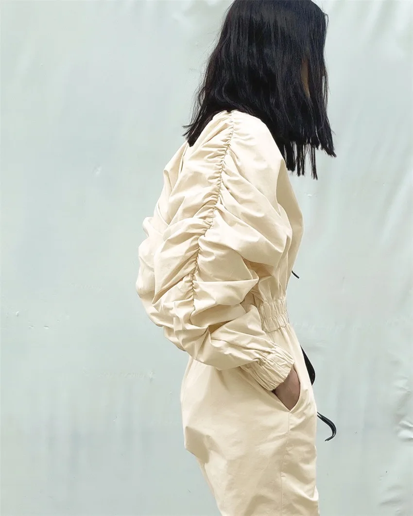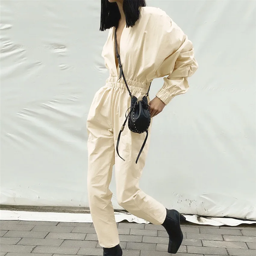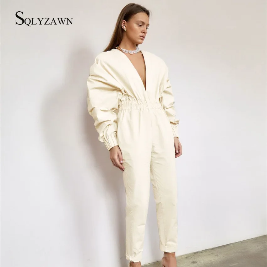 Женский комбинезон с глубоким V-образным вырезом, плиссированный комбинезон с пышными длинными рукавами, на осень и зиму, 2020