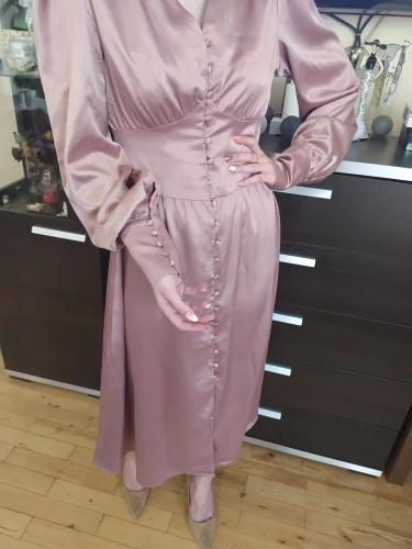 я долго искала и ждала хоть где-то отзыв с фото на платье в этом цвете, не дождалась)) платье замечательное, цвет как на фото продавца, очень красивый и нежный, ткань плотная размер выбирайте исходя из объёма под грудью, иначе будут некрасиво топорщиться пуговицы