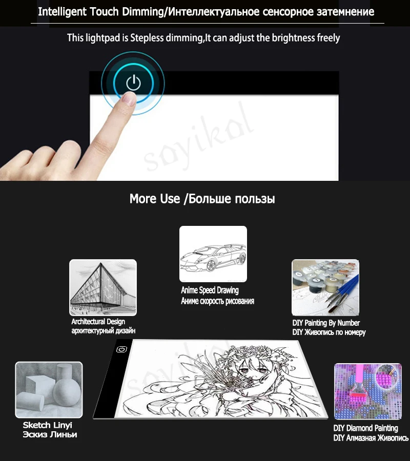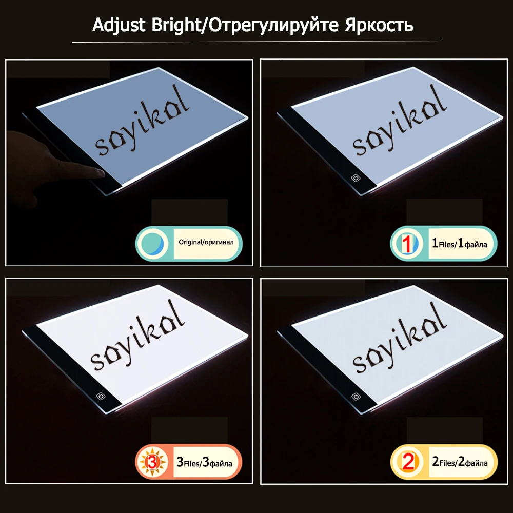 Таким образом, вы можете установить его в соответствии с вашими предпочтениями. Технология, защищающая зрение: без мерцания, супер яркий экологически чистый светодиод, конструкция сенсорного переключателя, включение/выключение и Управление яркостью легко просто легким прикосновением. Обновлено с мая 2018 года: у нас есть прозрачная защитная пленка на прокладке, которая может сделать поверхность появляющейся использованной. Пожалуйста, удалите его перед использованием. 【Широкое применение 】-идеально подходит для трафаретов, 2D анимаций, каллиграфии, тиснения, скрапбукинга, переноса татуировок, эскизов и рисования, швейных проектов, витражных стекол, квилтинга, Аппликации, рентгеновского просмотра и т. д. [Отличное послепродажное обслуживание]:-Прямая продажа с фабрики с отличным обслуживанием, если у вас есть какие-либо вопросы, проблемы, предложения, пожалуйста, просто оставьте сообщение продавцу, предложение/решение будет предоставлено в течение 24 часов, мы дорожим каждым покупателем, независимо от того, большой или маленький бизнес, Забота о всех покупателях и клиентах-это дух нашей компании. 1. Нет режима затемнения: Не затемнения, только один обычный режим яркости. 2. Плавный режим затемнения: с 0-100% градиентной яркостью нажмите и удерживайте кнопку, чтобы переключить яркость; Есть 0-100% градиентная яркость, которая может быть скорректирована произвольно, И яркость может быть скорректирована в соответствии с вашими потребностями. 100% является самым сильным. 3. Трехуровневый режим затемнения: только три уровня яркости, и третья передача является самой сильной.