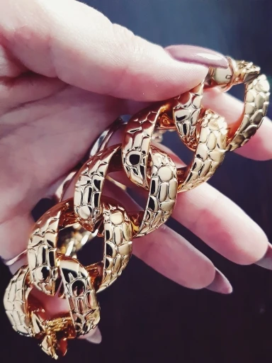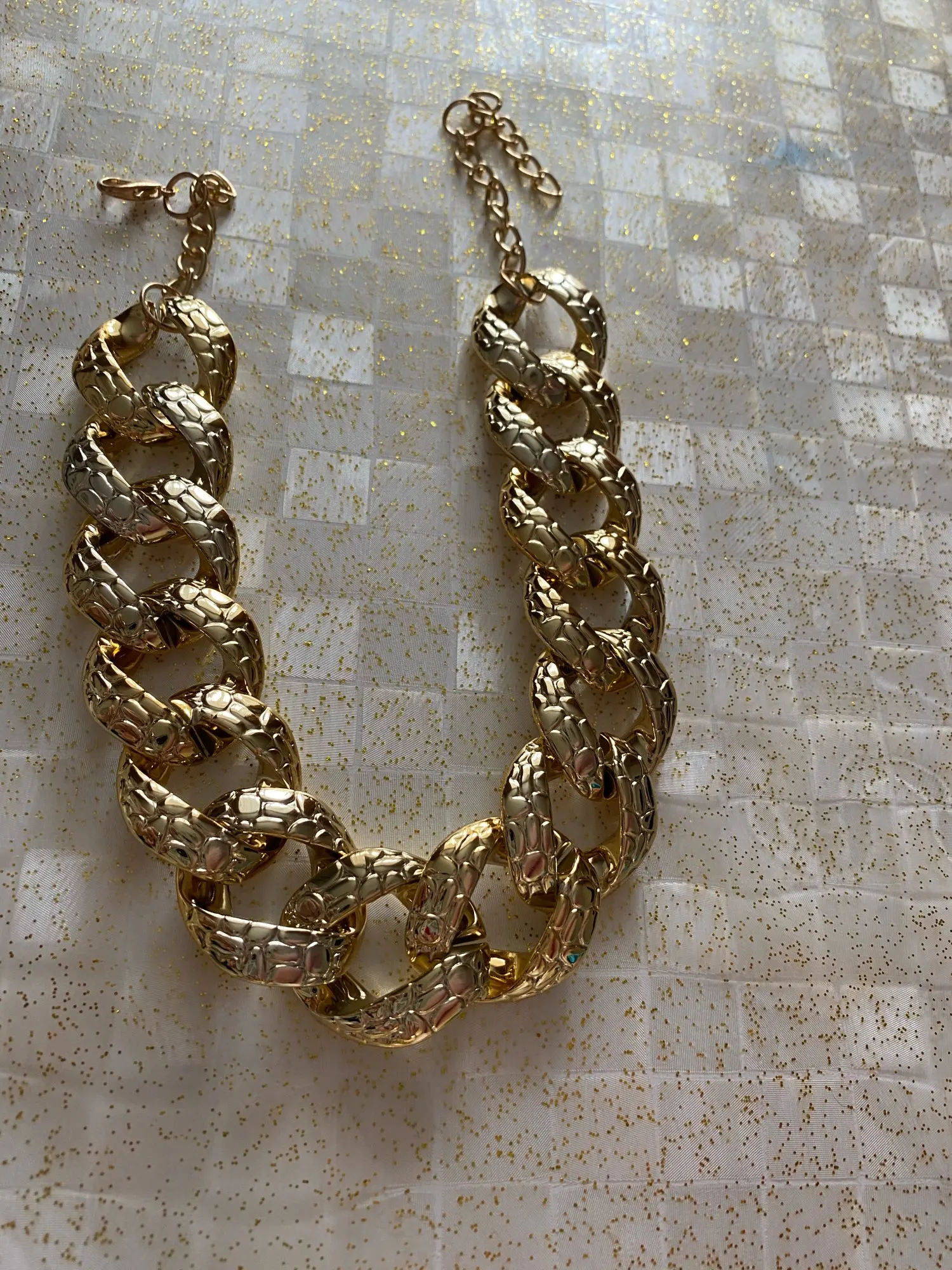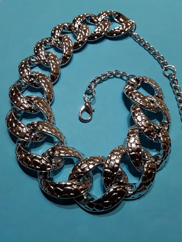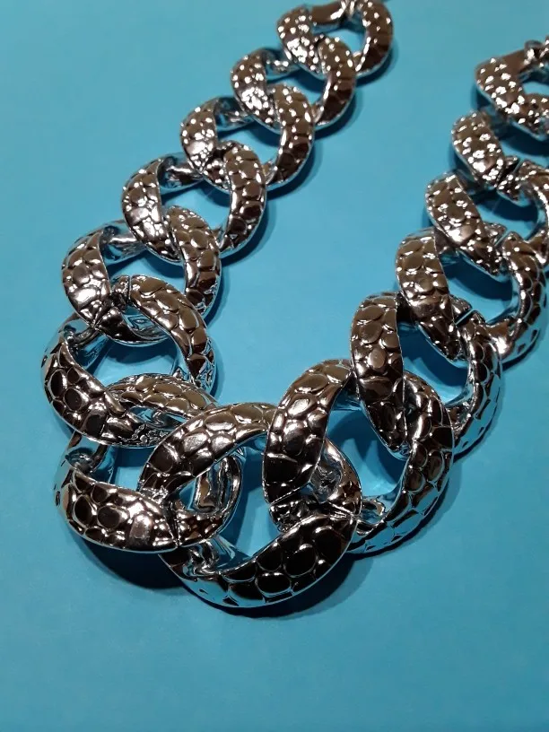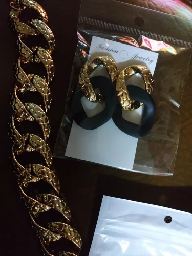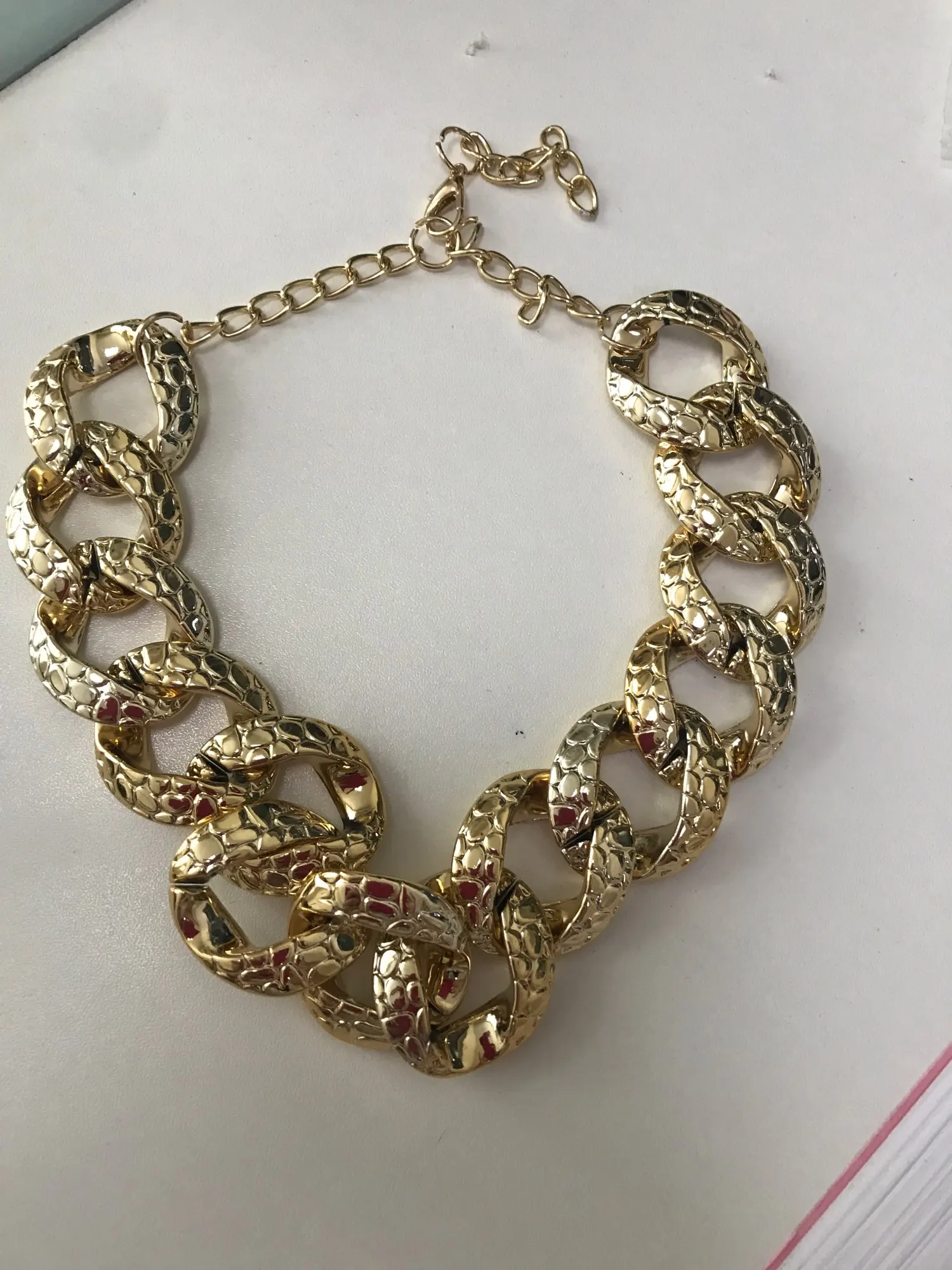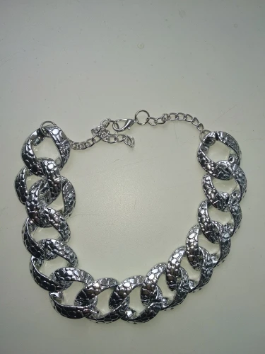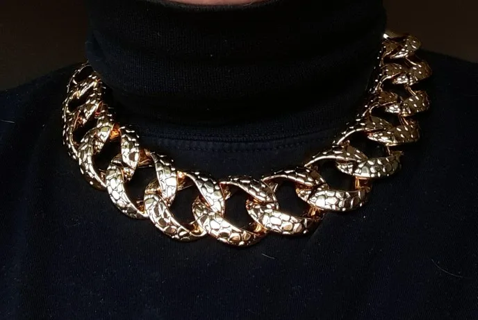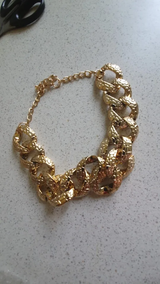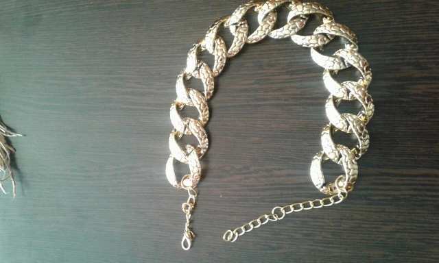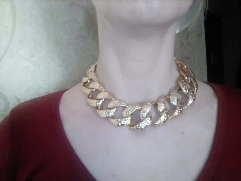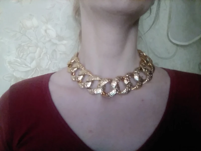 Колье шикарное! Цепь массивная, с выделкой под кожу рептилии. Лёгкая, пластиковая, покрытие качественное, без дефектов, наплывов и царапин. Надеюсь, не облезет быстро. Собственно, за 120 рублей, сколько прослужит, за то и спасибо :-) Короткая, прямо под горло, на фото с максимальным удлинением. Хорошо выглядит и на одежде и на открытой шее. В комплект заказала маленькие серёжки, у другого продавца. Доставка до Подмосковья две недели, в консолидированной посылке. Отслеживание подробное. К покупке рекомендую, продавцу спасибо и успехов в бизнесе!