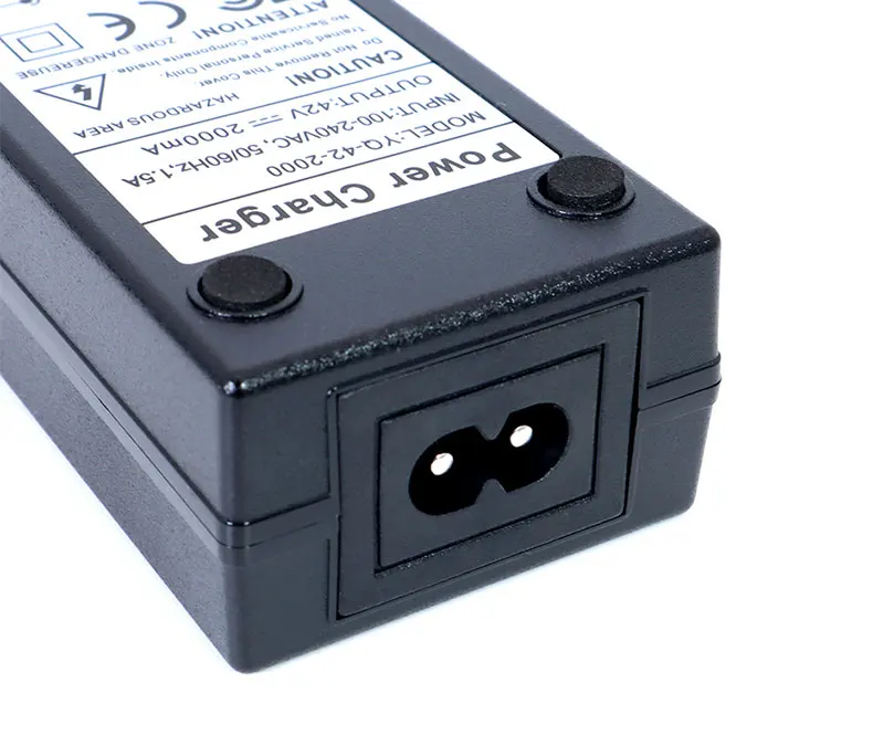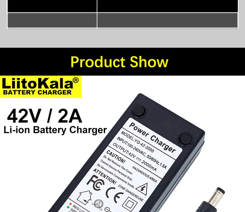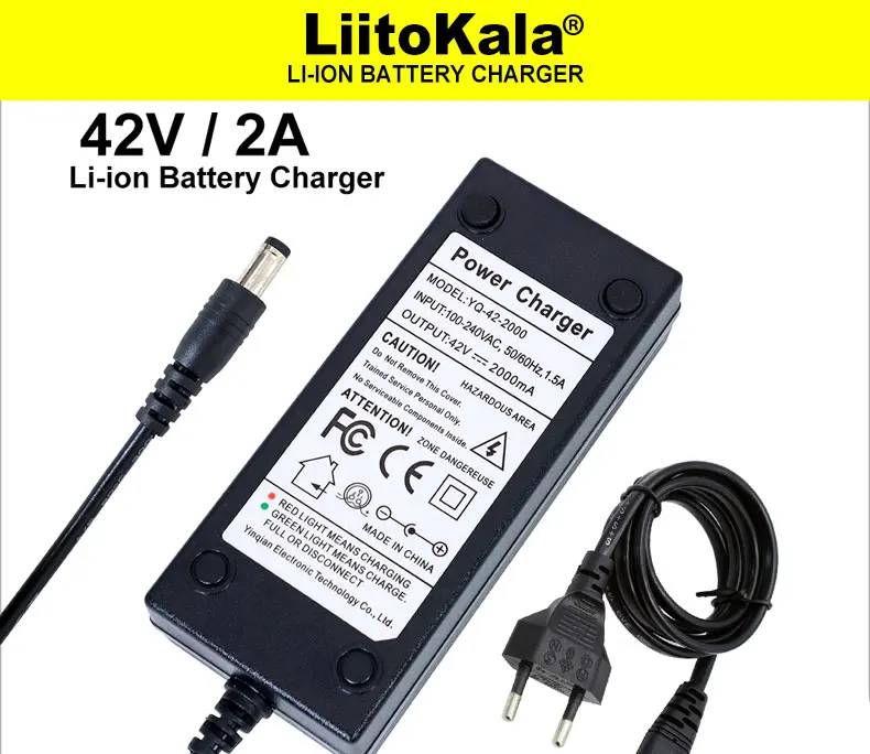 3.Liitokala :42V 2A Зарядное устройство: Макс. Выходное напряжение: 42 в Входное напряжение: 100-240 В переменного тока Макс. Выходной ток: 2А Частота линии: 50-60 Гц Эффективность (100% нагрузка):> = 85% Диапазон температур: 0-45 "C Относительная влажность: <65% Защита Защита от перенапряжения Защита от перегрузки по току ОБЩАЯ СПЕЦИФИКАЦИЯ 3-ступенчатый контроль заряда (предзарядка CC-CV) Вариант: a) NTC внутри B) 100% отключается, когда аккумулятор полностью заряжен Двойной Цветной светодиодный дисплей: (зарядка: красный, полностью заряженный или без нагрузки: зеленый) Легкий и компактный Высокая эффективность и низкое энергопотребление Экологическая спецификация