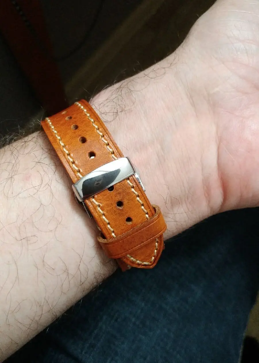 Всё залюбись. До Н.Новгорода шёл 2 недели. Отслеживался по всем контрольным точкам. Ремешок огонь, я доволен. Толщина 3,5 мм. В комплекте инструмент для монтажа ремня и три запасных пина. Мои часы 42 мм. Обхват запястья 19 см, застегнул на 4-ое отверстие. Второй тренчик убрал за ненадобностью. Застежка-бабочка - это благо. Это гарантия от падения. Всё до разу. С этим рыжим ремешком часы стали смотреться ярче.