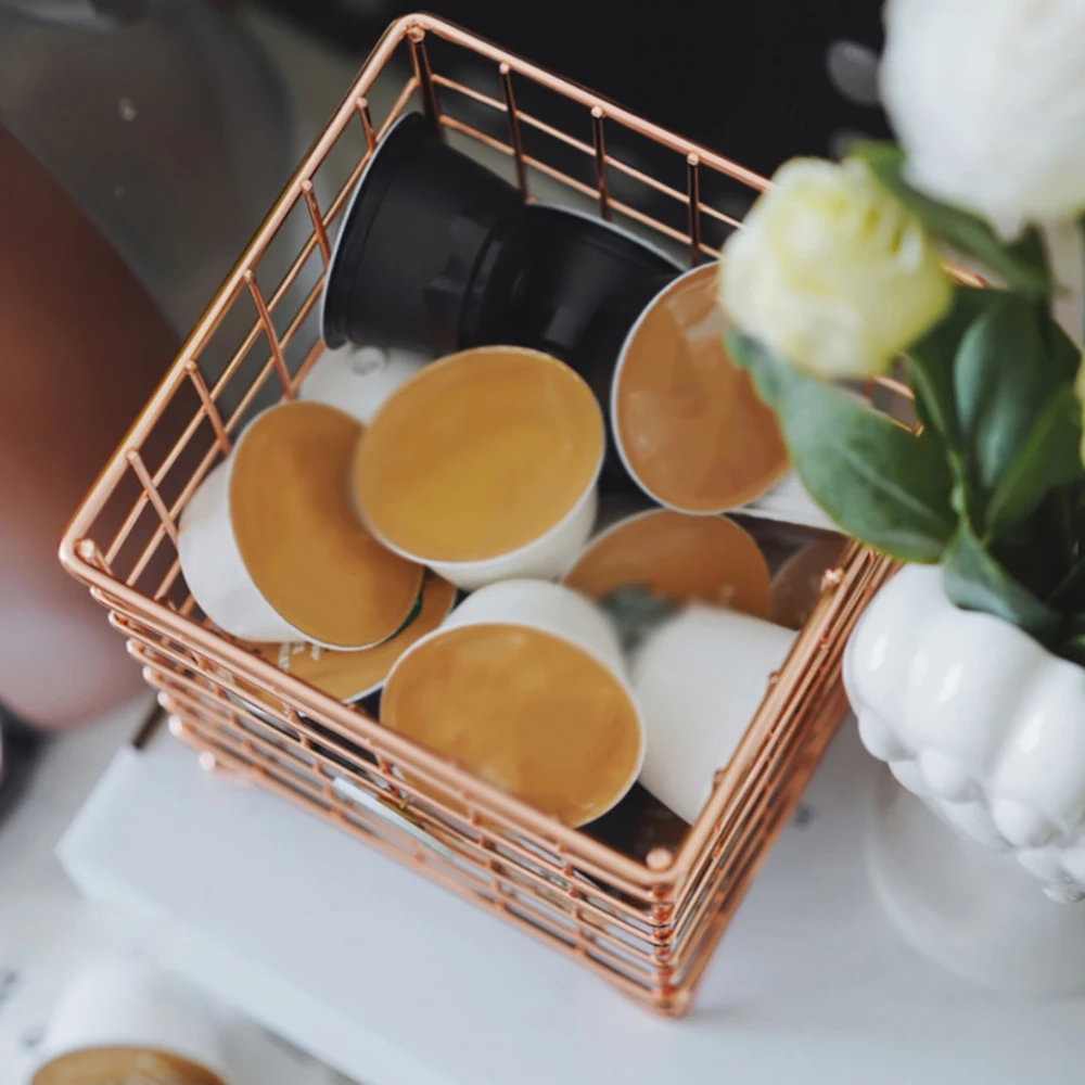 Хранение кофейных капсул Корзина изготовлена из металла, прочная и долговечная, с современным дизайном сетки, Воздушная и красивая.