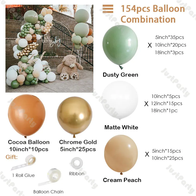 154 шт (14 футов) шар гирлянда Арка Упаковочный лист:Пыльно-зеленый (5 дюймов * 35 шт., 10 дюймов * 20 шт., 18 дюймов * 4 шт.)Матовый белый (10 дюймов * 5 шт., 12 дюймов * 15 шт., 18 дюймов * 1 шт.)Кремовый персик (5 дюймов * 15 шт., 10 дюймов * 25 шт.)Какао-шар 10 дюймов * 10 шт