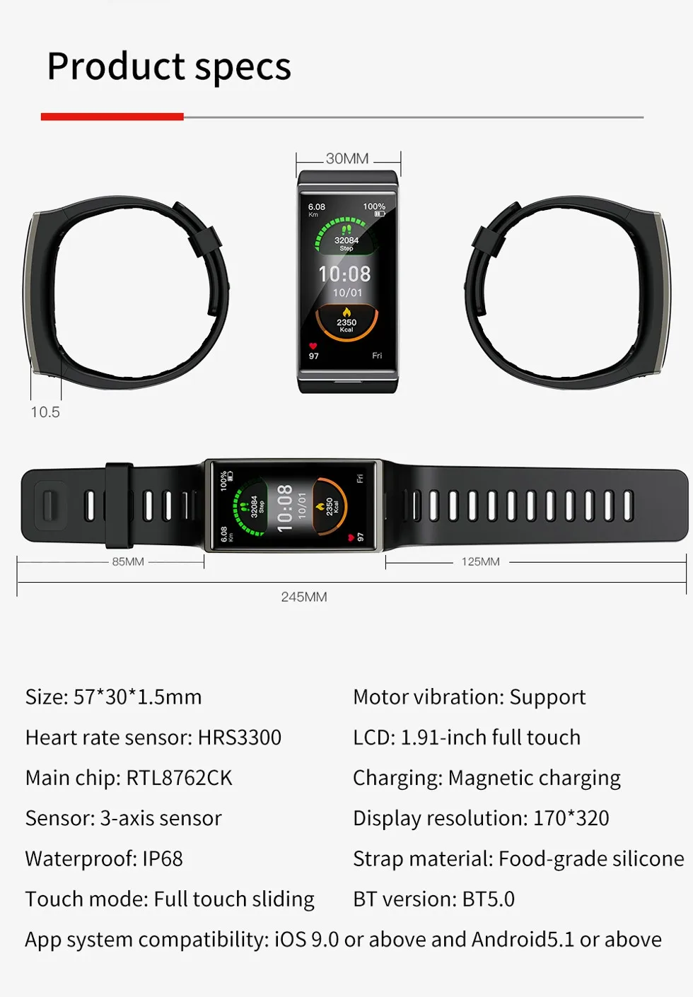 * Экран: Полный сенсорный экран HD 1,9 дюйма 170*320 Разрешение Цвет Экран * Аппаратная платформа: RTL8762CK , Ram + Rom: 64Mb * IP68 Водонепроницаемый и пыленепроницаемый (можно носить под дождем, мыть руки, но не помещать в горячую воду) * Несколько спортивных режимов (7 спортивных режимов), Спортивная запись, просмотр шагомера, калорий, пульс при выполнении упражнений. * Динамический монитор сердечного ритма и артериального давления, мониторинг сердечного ритма в реальном времени для защиты вашего здоровья (поддержка анализа данных в приложении). * Напоминание о звонках, SMS оповещения, уведомления в социальных сетях (электронная почта/Wechat/Facebook/Whatsapp/Skype и т. Д.) * Поддержка iOS 8,0 версии выше и Android 4,0 версии выше * Язык часов: китайский, английский * Язык приложения (имя приложения/APK FFit) : FFit-Поддерживаемые android языки Английский Китайский Японский Французский Немецкий Итальянский Испанский Русский Португальский малайский корейский польский FFit-Поддерживаемые iOS языки Английский Китайский Японский Французский Немецкий Итальянский Испанский