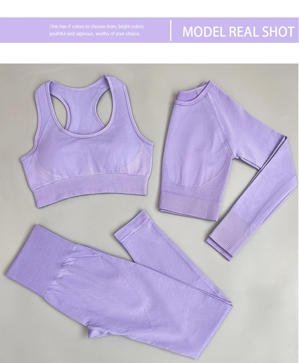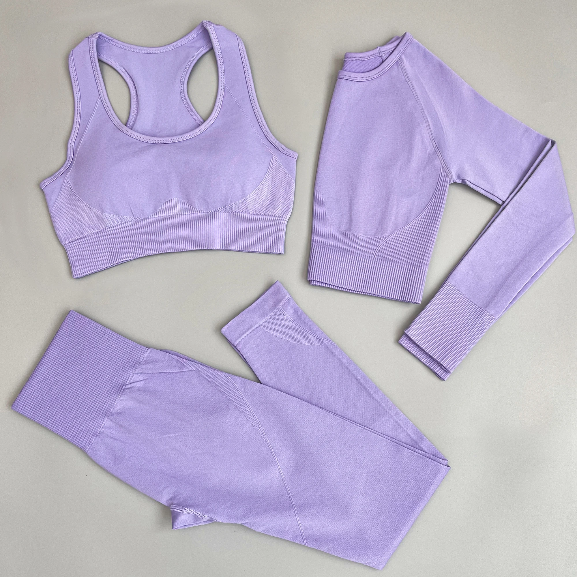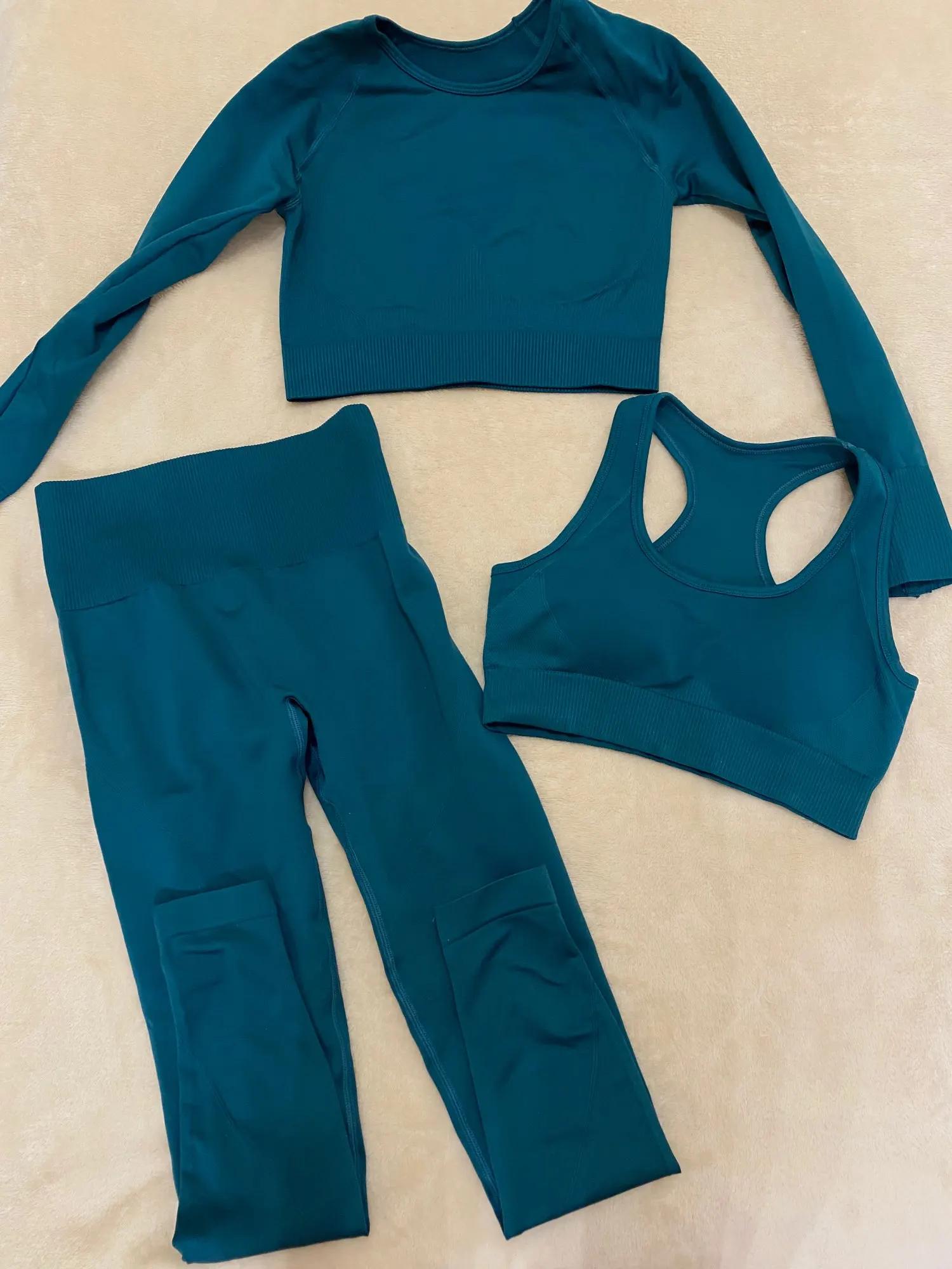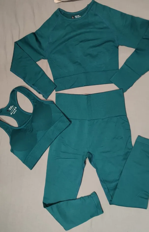 Костюм для фитнеса тройка на любой сезон от AJYOOP. В магазине 5 цветов,также можно выбрать комплект из 3 или 2 вещей.Комплект бесшовный.И стильно и комфортно. Наш комплект включает: Топ с вставками пуш-ап, что очень удобно, Леггинсы с высокой посадкой и Верхнюю кофту с длинным рукавом со специальными прорезями на рукавах для большого пальца, по длине немного укороченная. Покупали размер М,на параметры:рост 172 см, ОГ 90 см, ОТ 60 см, ОБ 90 см, сел идеально.К прошивке претензий нет. Все швы ровные, нитки не торчат. Рекомендую.