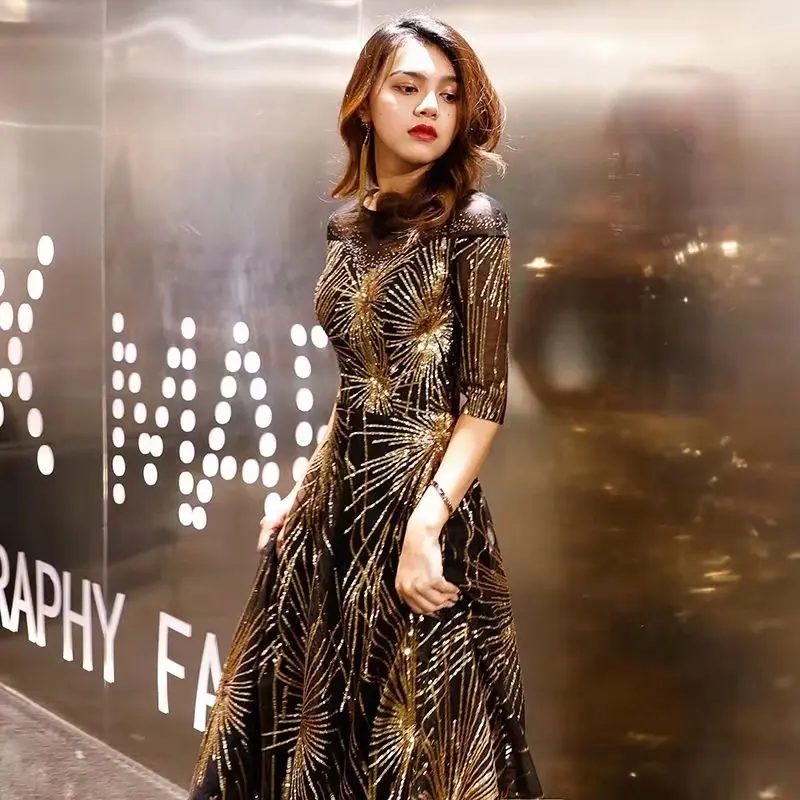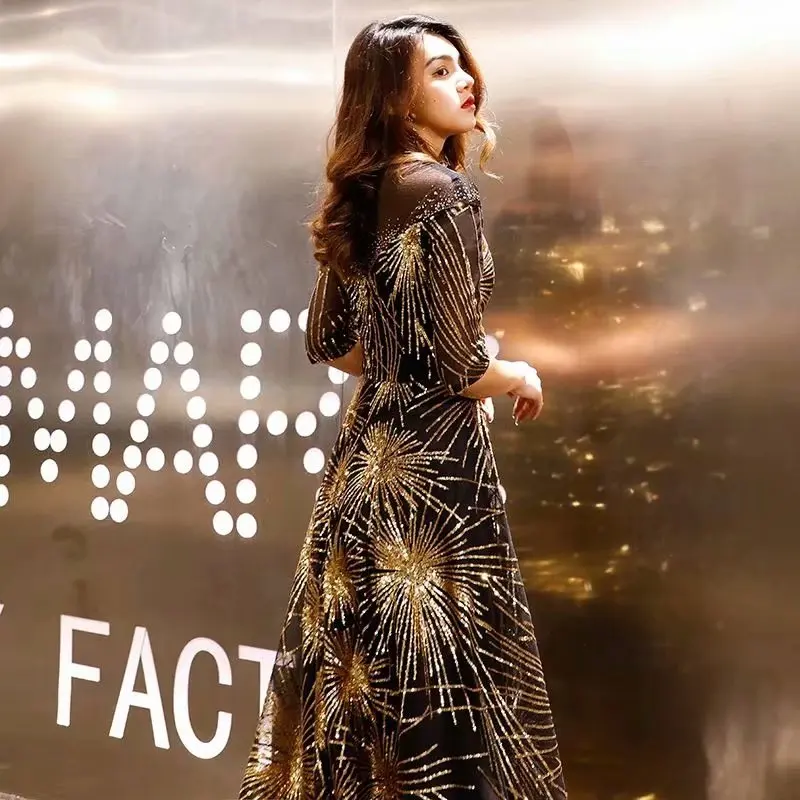 Женское вечернее платье с круглым вырезом, элегантное черное платье до пола с полурукавами и золотыми блестками