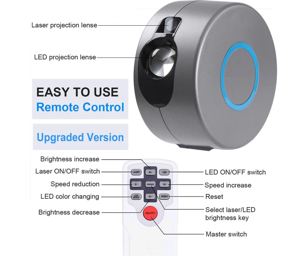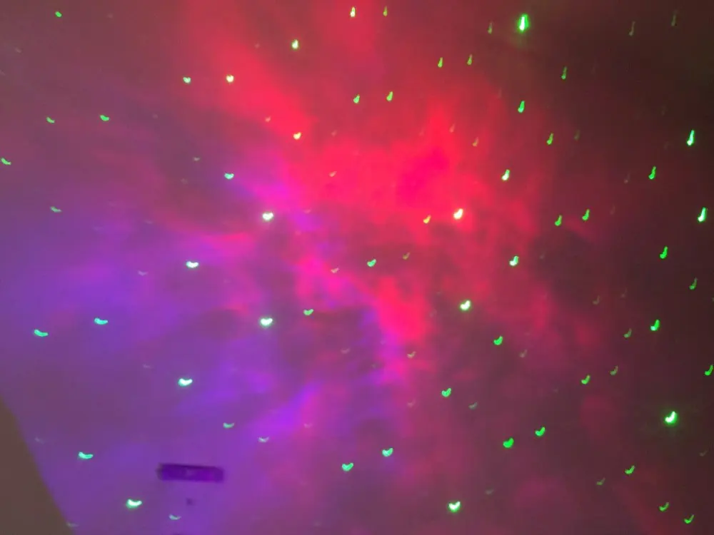 Очень доволен проектором, пульт дистанционного управления дает много возможностей: скорость, только звезды, только небольшие, цвета... Чтобы положить немного клея, зеленый цвет звезд был бы красивее в синем или желтом. Проекция очень мягкая, а эффект замечательный и очень расслабляющий. Оно того стоит.