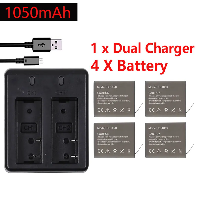 Аккумулятор для камеры PG1050, SJ4000, 4 шт., 1 двойное зарядное устройство для SJCAM SJ4000, SJ5000, SJ6000, SJ8000, M10, EKEN 4K, H8, H9, H9R, H8 PRO