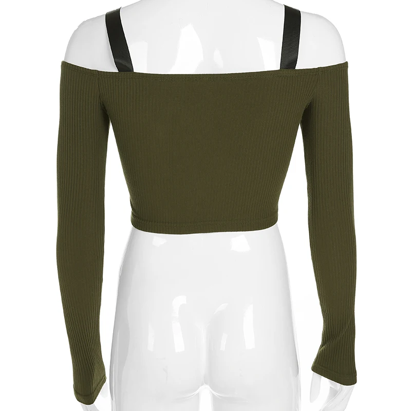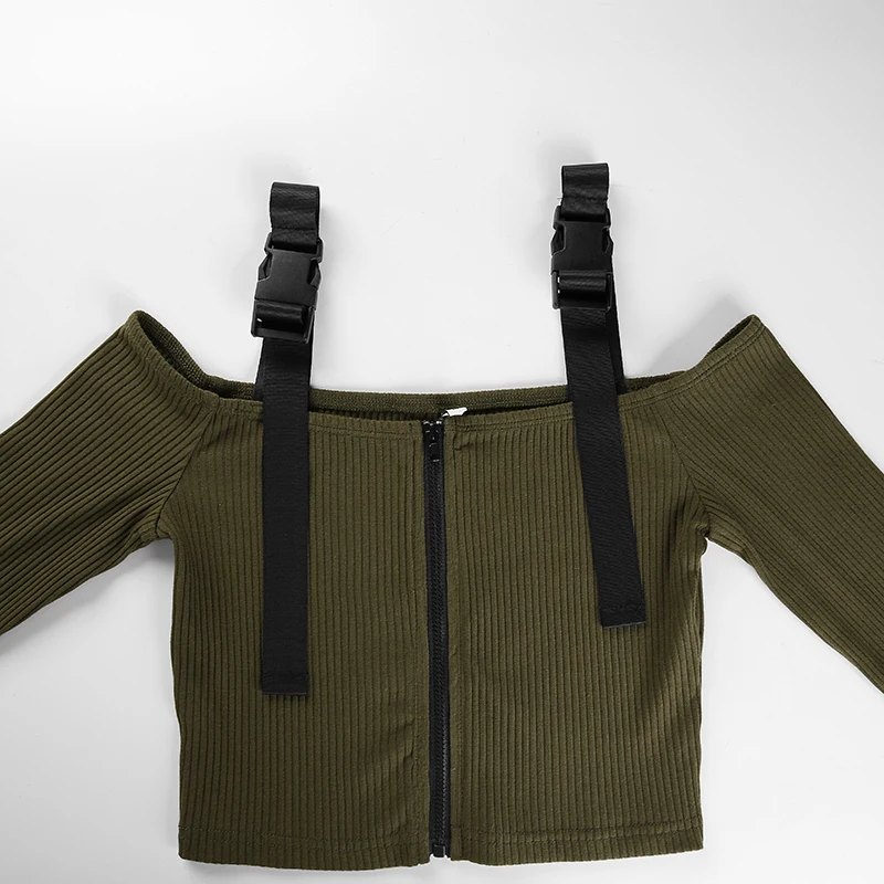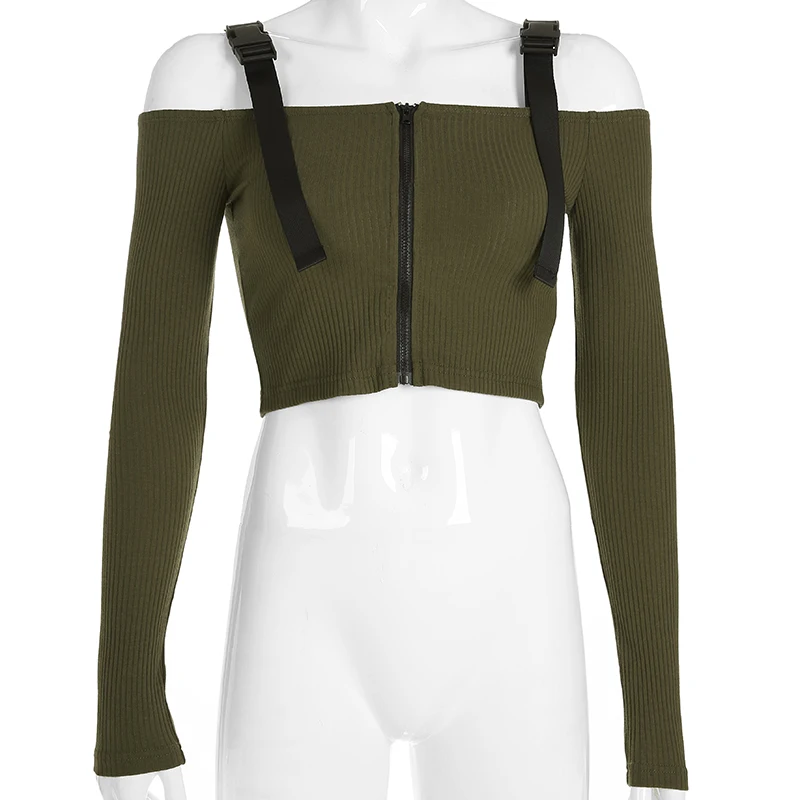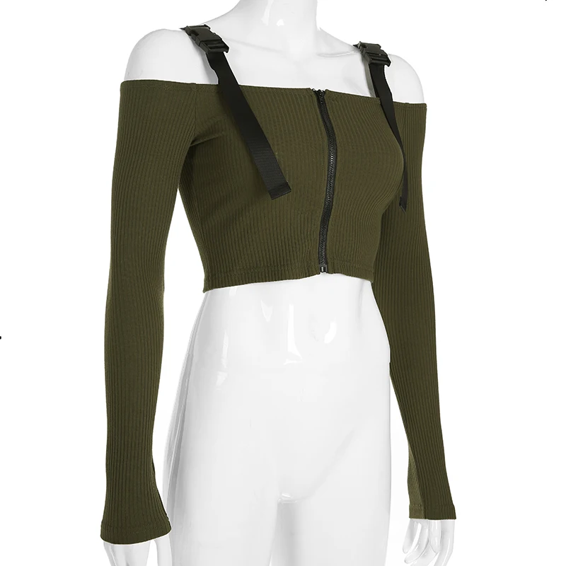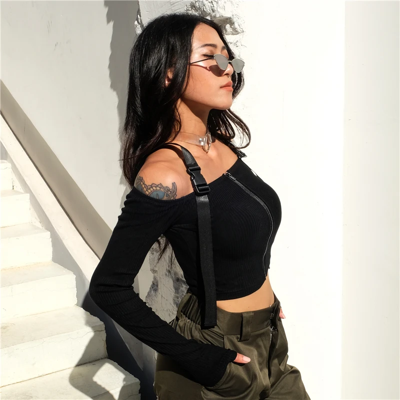 Модная женская одежда с открытыми плечами, однотонные топы на молнии, хлопковые повседневные облегающие футболки с длинным рукавом