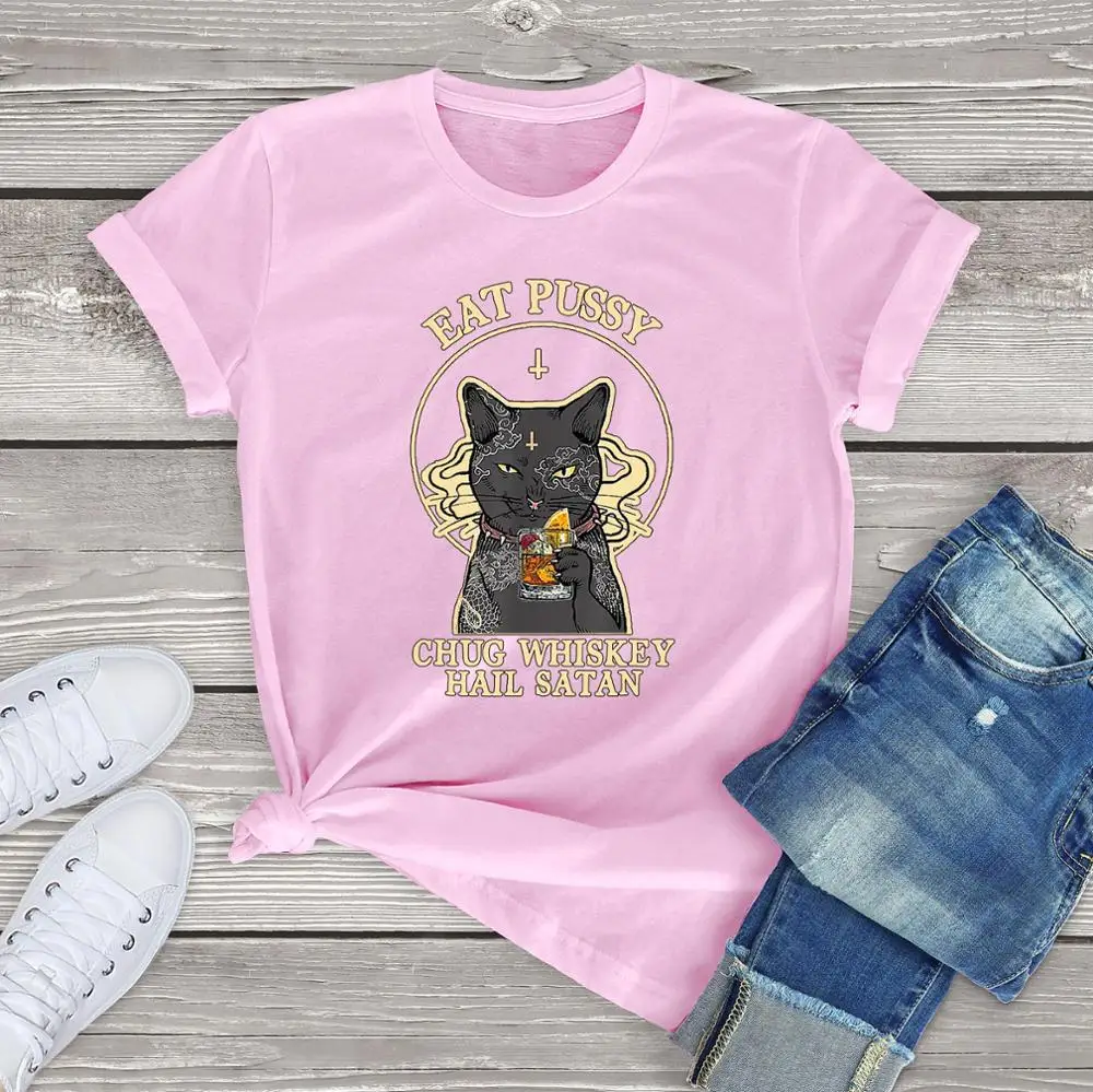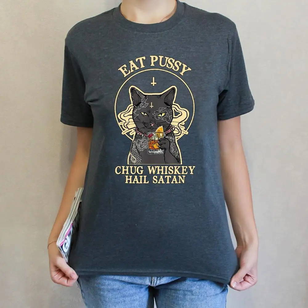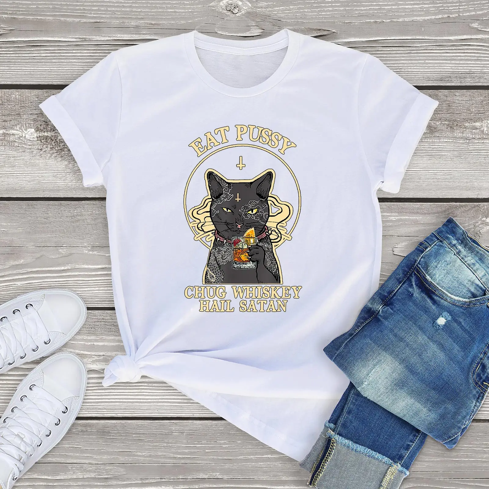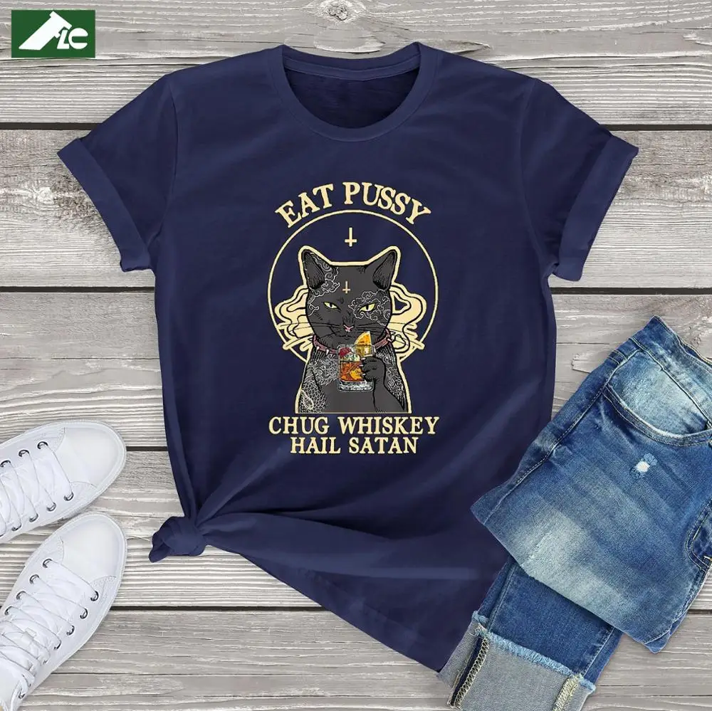 Футболка FLC из 100 хлопка, женская футболка с аниме «Черный кот есть киски виски», винтажная черная футболка унисекс с надписью «Hail Satan», женские топы в подарок