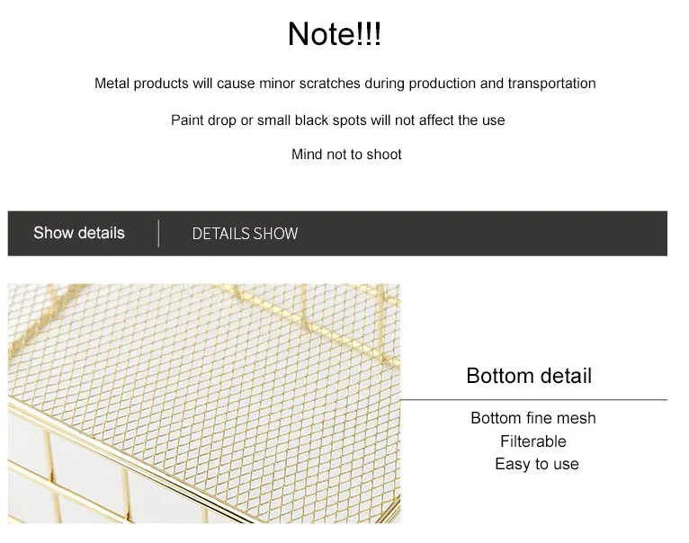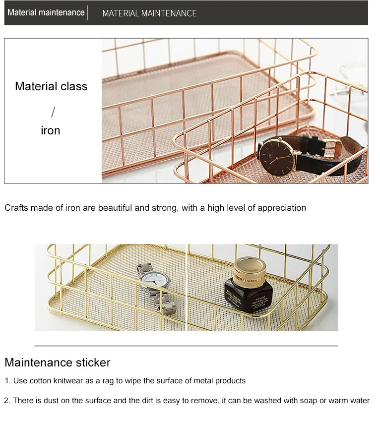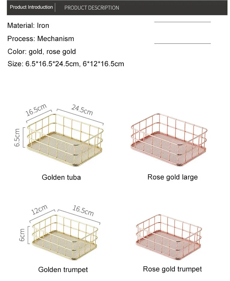 Категория продукта: корзина для храненияМатериал: железоЦвет: Золотой, розовое золотоОбласть применения: пульт дистанционного управления, канцелярские принадлежности, фрукты, медицина, косметика/ювелирные изделия, кабель для наушников/проводВес: большая корзина для хранения: 222 г, маленькая корзина для хранения: 149 г, круглый держатель ручки: 98 г, квадратный держатель ручки: 130 гПримечание:1. Размеры изделия измеряются вручную, могут быть некоторые ошибки, пожалуйста, простите меня2. Из-за дисплея и угла съемки, могут быть некоторые различия в цвете. Пожалуйста, обратитесь к фактическому продуктуСтикер для обслуживания1. Используйте хлопчатобумажный трикотаж в качестве тряпки для протирания поверхности металлических изделий2. На поверхности есть пыль, и грязь легко удаляется, ее можно мыть с мылом или теплой водой