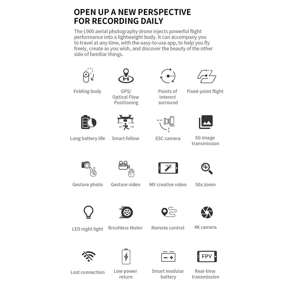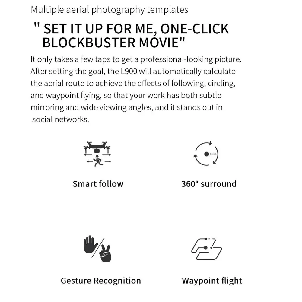 Особенности:1. Он может управляться через приложение мобильный телефон, следить за ним, окружать, точка для полета, Скриншот жестов и функция удаления.2. Вперед, назад, поверните налево, поверните направо.3. Безголовый режим, режим оптического потока, один ключ, чтобы вернуться на главную страницу, следуйте фото/видео.4. Один ключ геомагнитной калибровки, аварийной остановки, GPS позиционирования обратно в место происхождения, назначенный полет.5. Добавлен AR/VR 3D Видео Стерео анимация спецэффекты.Спецификация:Номер: L900Цвета: черный, белый и оранжевыйВес квадрокоптера: около 213,8 гБатарея дистанционного управления: 3,7 V 350mAh литиевая батарея (входит в комплект)Перезаряжаемая батарея квадрокоптера: литиевая батарея 7,4 V 2200mAh (входит в комплект)Время зарядки: 4 часа или болееВремя полета: 25-28 минутКвадрокоптер Размер: около 32*32*5 см/12,60*12,60 * 1.97in (в сложенном виде), около 13*10*5 см/5,12*3,94 * 1.97in (в сложенном виде)Расстояние дистанционного управления: около 1200 метров/3937,01 футов (без помех, без препятствий)Расстояние передачи графики: около 300-600 метров/984,25-1968,50 футов (без помех, без препятствий)Количество каналов: 4 каналаПоворот: 6 осейМотор: 1503 бесщеточный моторМеханизированная камера регулировка угла: 90 °Угол обзора камеры: 120 °Настройки частоты: 5G/2,4 ГГцМетод передачи: FPVРазрешение фото: 4096*3072P (4K)Разрешение видео: 2048*1080PРазрешение нижней камеры: 640*480PРазрешение видео нижней камеры: 1280*720PРежим записи фотографий: приложение с дистанционным управлениемУпаковочный лист:1 * Радиоуправляемый Дрон1 * пульт дистанционного управления1 * батарея самолета2 * Запасные пропеллеры1 * USB кабель для зарядки1 * отвертка