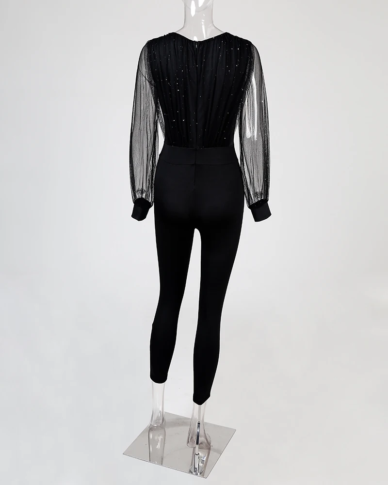2020 женский модный элегантный повседневный прозрачный сетчатый Блестящий дизайнерский комбинезон с карманами и V-образным вырезом, длинный рукав, пикантный дизайн с карманами