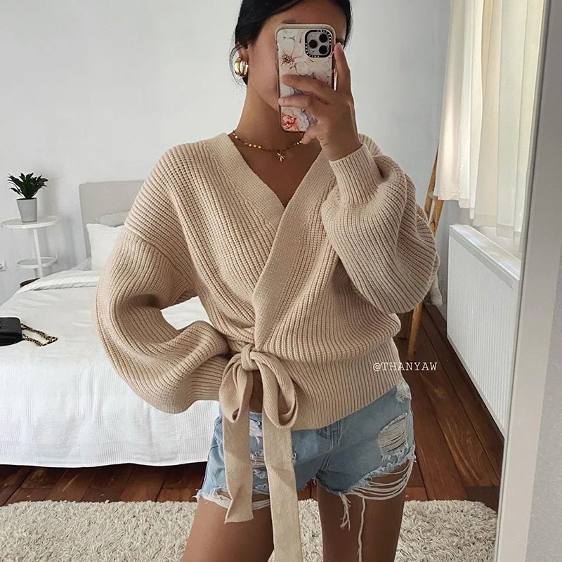 Женский кардиган на завязках, Однотонный свитер с V-образным вырезо...