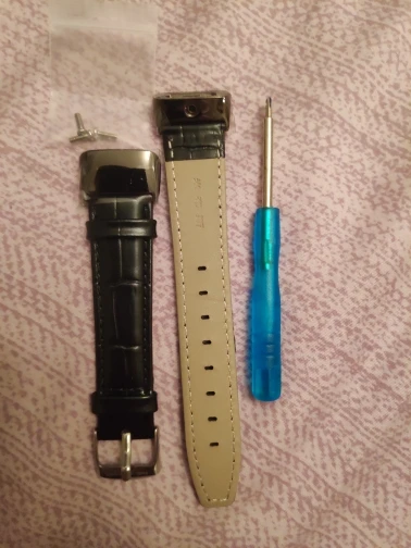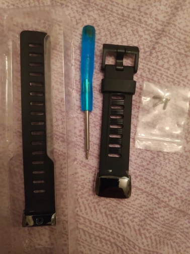 Пластиковый мягкий браслет. в комплекте идут три винта и отвёртка. Идеально подошёл к часам. Удобный при ношении. Отвёртка не очень хорошо подходит к родным винтам, но открутить можно. Винты идут без фиксатора резьбы.