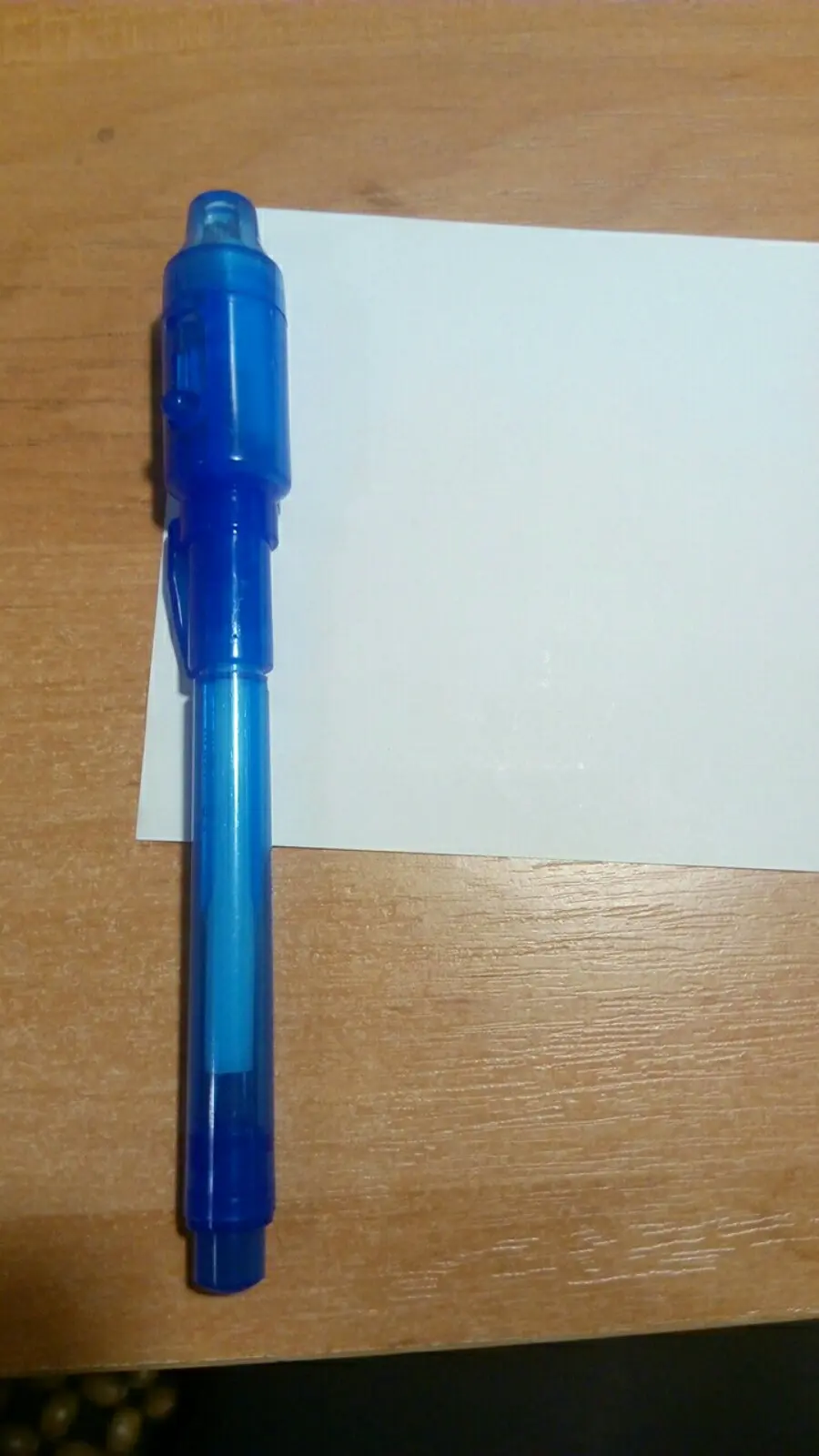 ручка понравилось. пишет бесцветной пастой которую видно только при свете фонарика.кнопка фонарика нажимается с приятным щелчком свети хорошо.пастик прячется поворотом частей ручки.доставка Украина Мариуполь.рекомендую. Фотографировать не чего ручка как в описании.