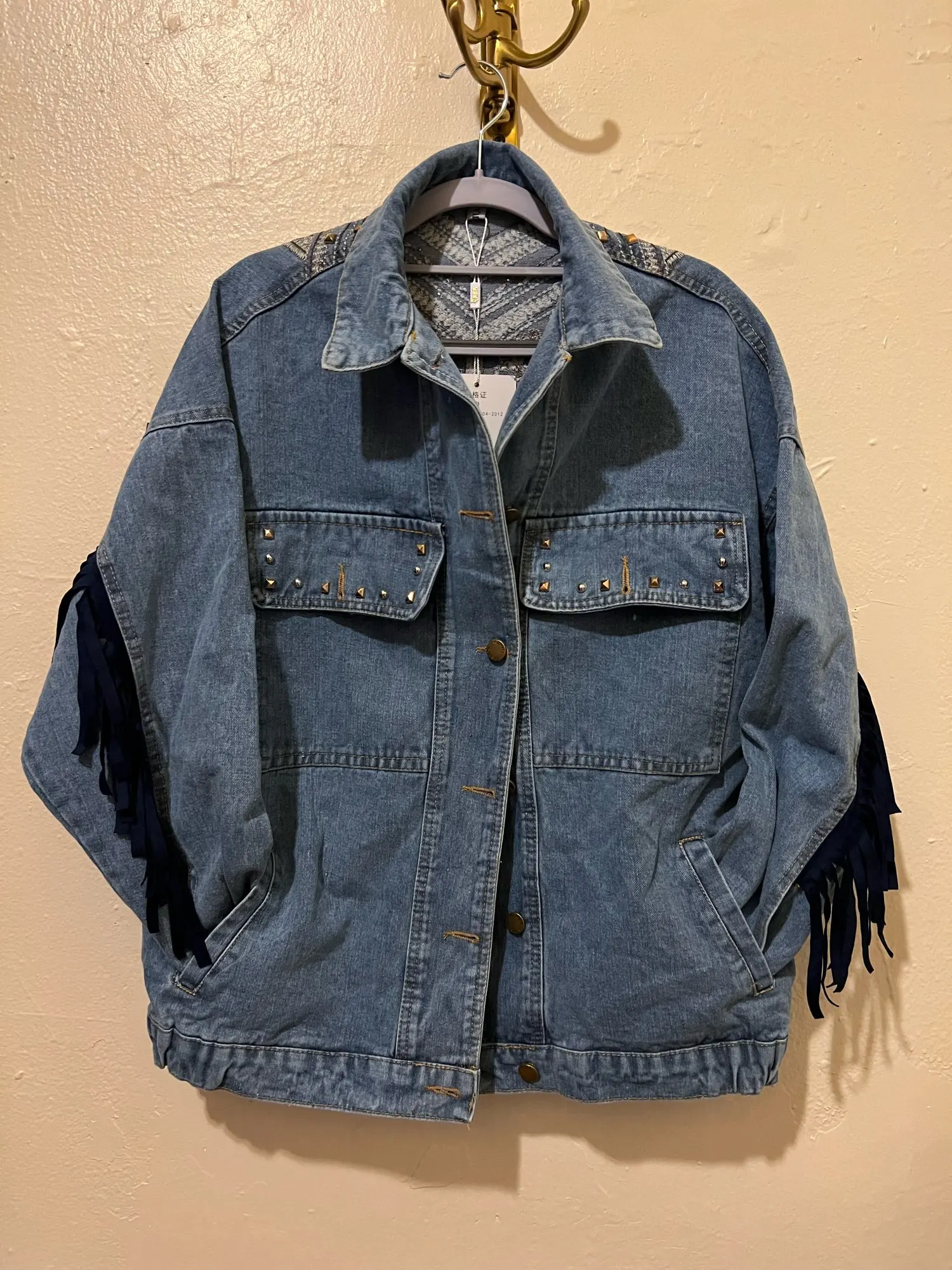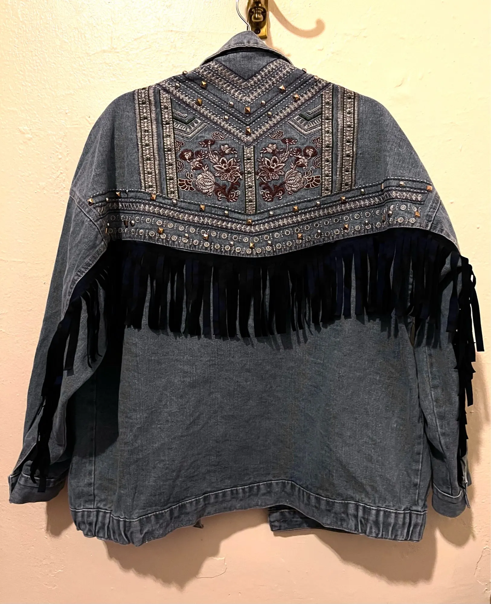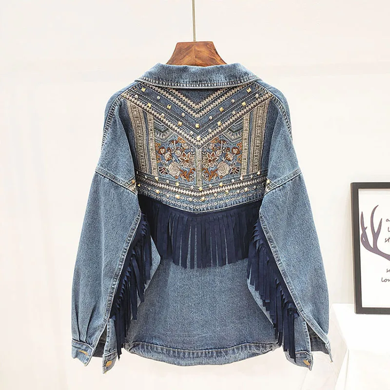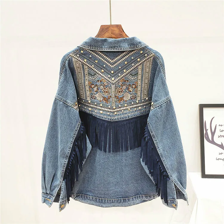 Джинсовая куртка с цветочной вышивкой, замшевое свободное джинсовое пальто с бахромой, Женское пальто, верхняя одежда с длинным рукавом, Женская винтажная уличная одежда