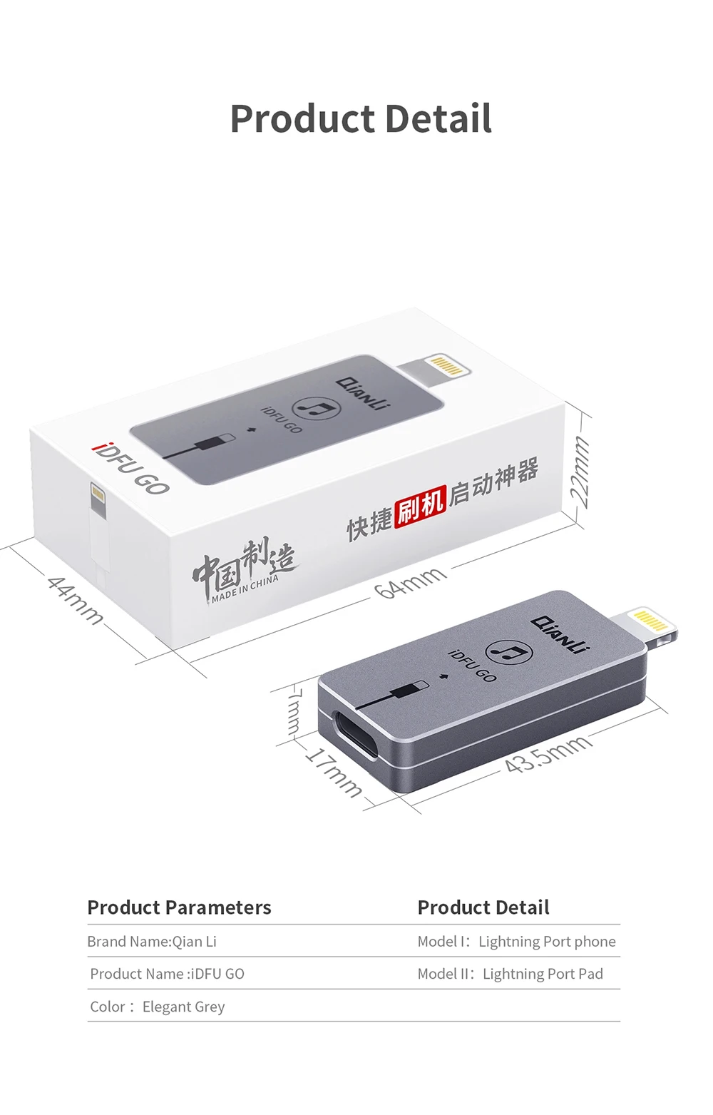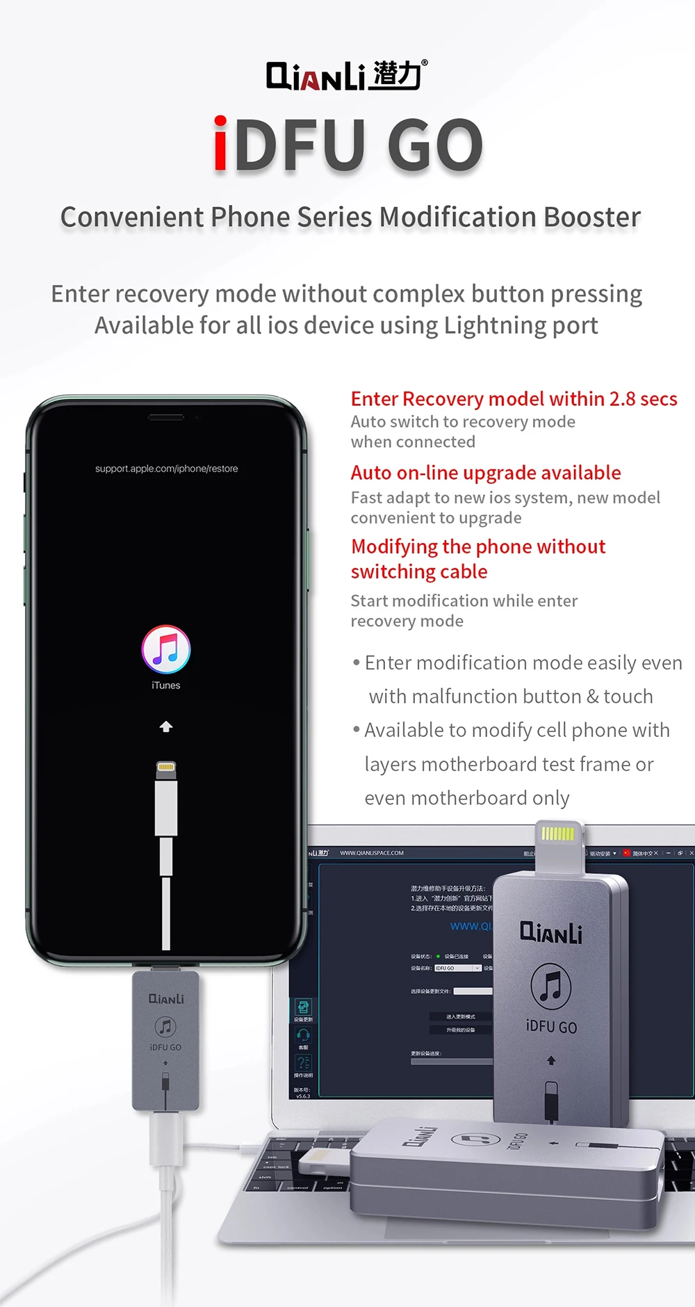 Быстрый запуск вспышки Никаких утомительных шагов, непосредственно введите Режим восстановления, поддержка всех устройств IOS с интерфейсом lightning 1: 2,8 секунд, чтобы ввести режим DFU без нажатия клавиш 2: быстро адаптируется к новой системе IOS. Новые модели. Обновление не требуется 3: щетка непосредственно после входа в DFU. Нет необходимости менять кабели Plug and play DFU Автоматическое обновление Не меняйте щетку кабеля Qianli iDFU поддерживает систему выше ios10.0, но не поддерживает систему ниже ios10.0