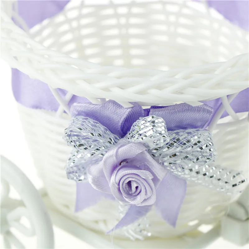 Характеристики: 100% новый бренд и высокое качество.Материал: ротанг и пластикЦвет: велосипед: белый; Лента: синий/розовый/фиолетовый, отправляется толькоРазмер: 22*11 смПосылка включает в себя: 1 x трехколесная корзина контейнер (только велосипедная корзина)