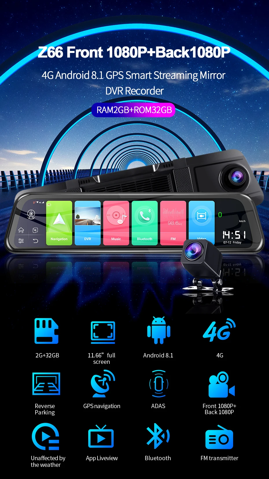 Зеркало заднего вида GreenYi, 11,66 дюйма, ОЗУ 2 Гб, ПЗУ 32 ГБ, 4G LTE, Android 8,1