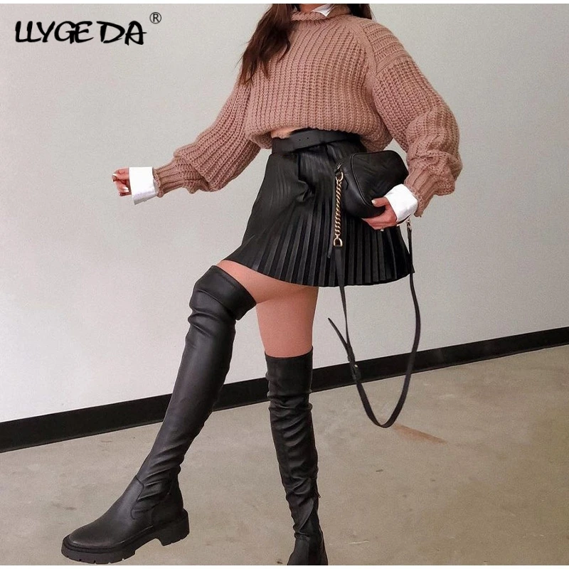 Твердые драпированные искусственные женские короткие юбки трапециевидной формы High Street Сексуальная мини-юбка Мода 2021 г. Корея Высокая талия плиссированные кожаные ткани