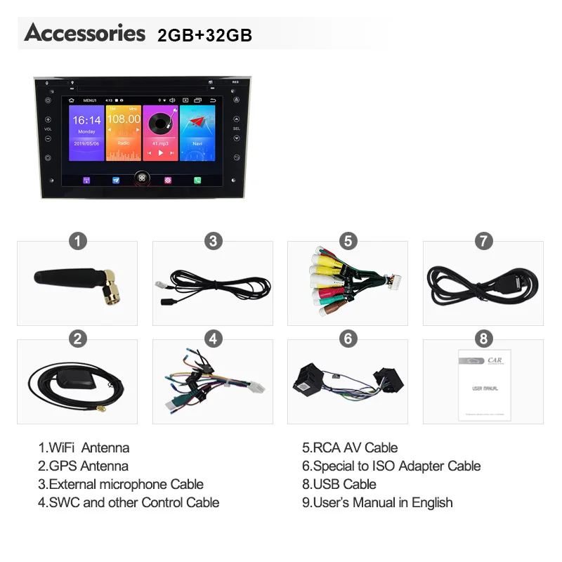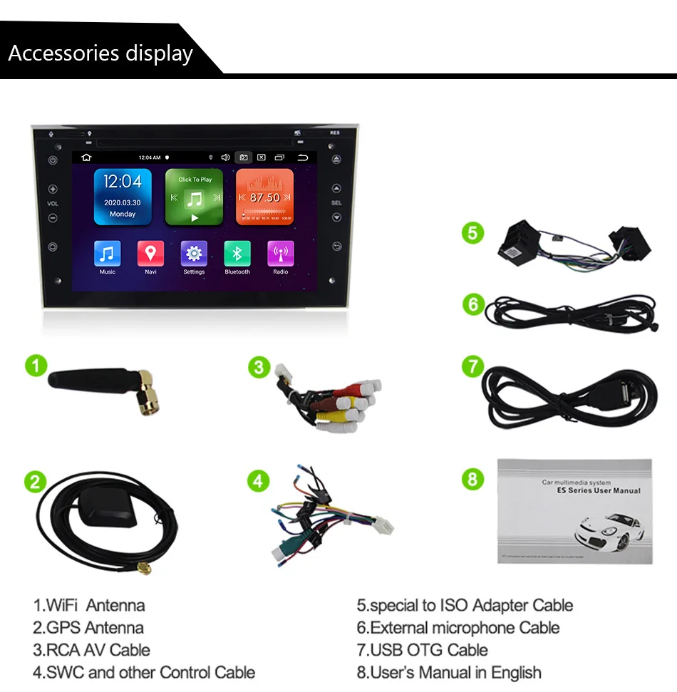 Подарки:1. Бесплатная карта2. Камера заднего вида бесплатноКлючевые особенности:1. Встроенный Carplay, нет необходимости использовать carplay ключ, подключите нашу машину к вашему смартфону напрямую2. Быстрая загрузка, всего две секунды, машина начнет3. ОС Android 10Функции:DVD / GPS / Bluetooth/Радио/RDS/встроенный WiFi / Mirror-Link / DSP/Встроенный CarPlay / USB / SWC / AUX in/Games/Встроенный Can-шина/8 цветов светильник кнопкаВидео вход: камераВход Аудио: AUX1Видеовыход: video1/video2Аудиовыход: FL/FR/RL/RR/сабвуферВерсия Bluetooth: 4,0Этот блок подходит для:Для Opel Astra 2004-2009Для Опель Антара 2006-2011Для Opel Vectra 2003-2008Для Opel Corsa 2006-2011Для Opel Zafira 2005-2011Для Opel Meriva 2006-2011Для Opel Vivaro 2006-2010Для Opel Tigra/ ComboVauxhall Corsa/ Astra/ Antara/ Zafira / Vectra 2006-2011Быстрая загрузка (обычно 2 секунды):