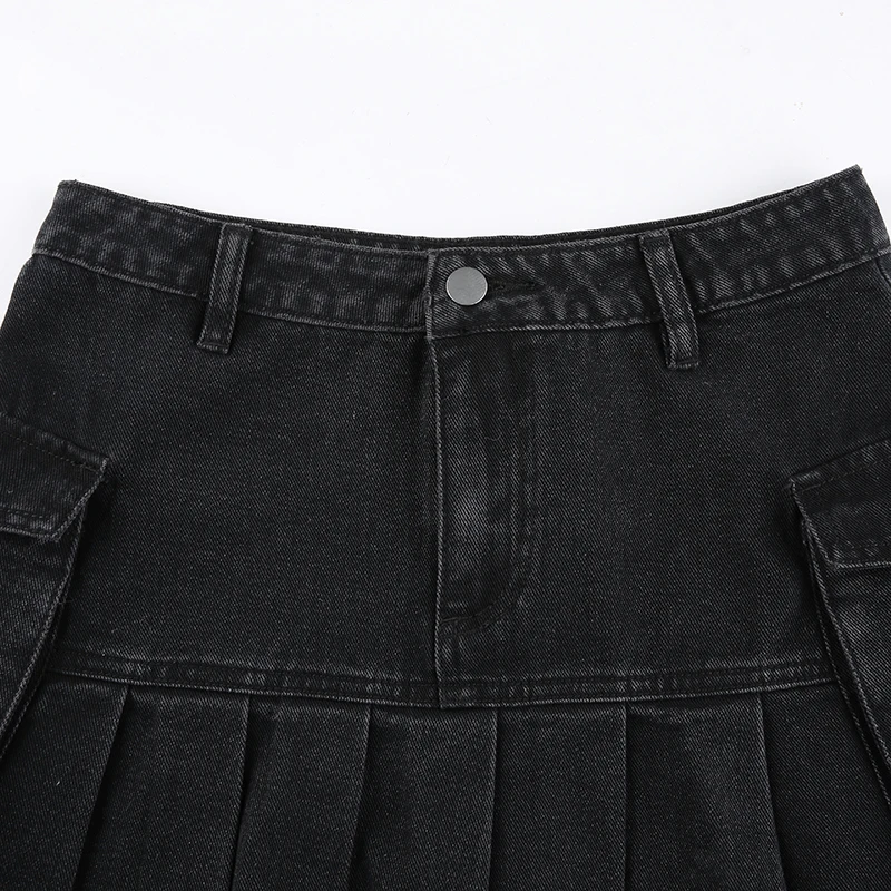 Y2K эстетичная черная джинсовая плиссированная юбка с большими карм...