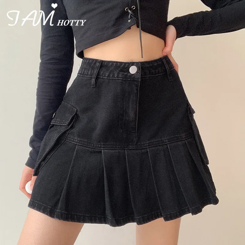 Плиссированная джинсовая юбка с карманами, женская черная трапециевидная пикантная короткая теннисная юбка для девушек, джинсовые юбки в Корейском стиле, Iamhotty