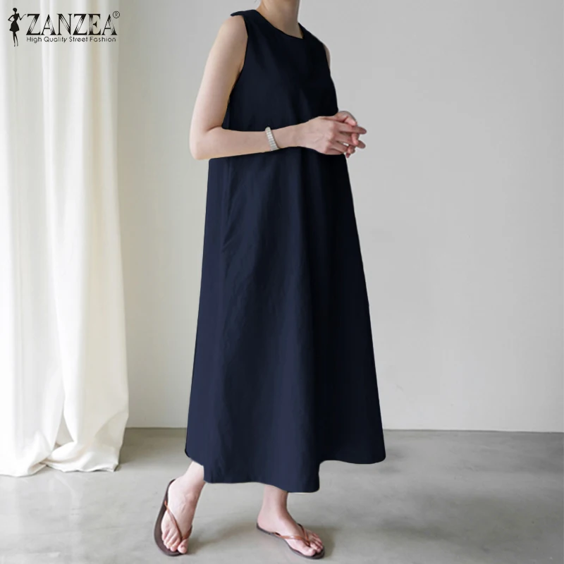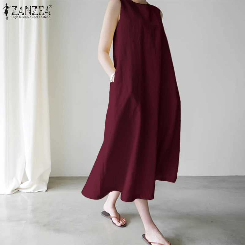 Платье ZANZEA женское повседневное свободного кроя, пляжный длинный Однотонный сарафан без рукавов, с круглым вырезом, лето 2021