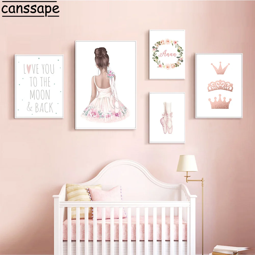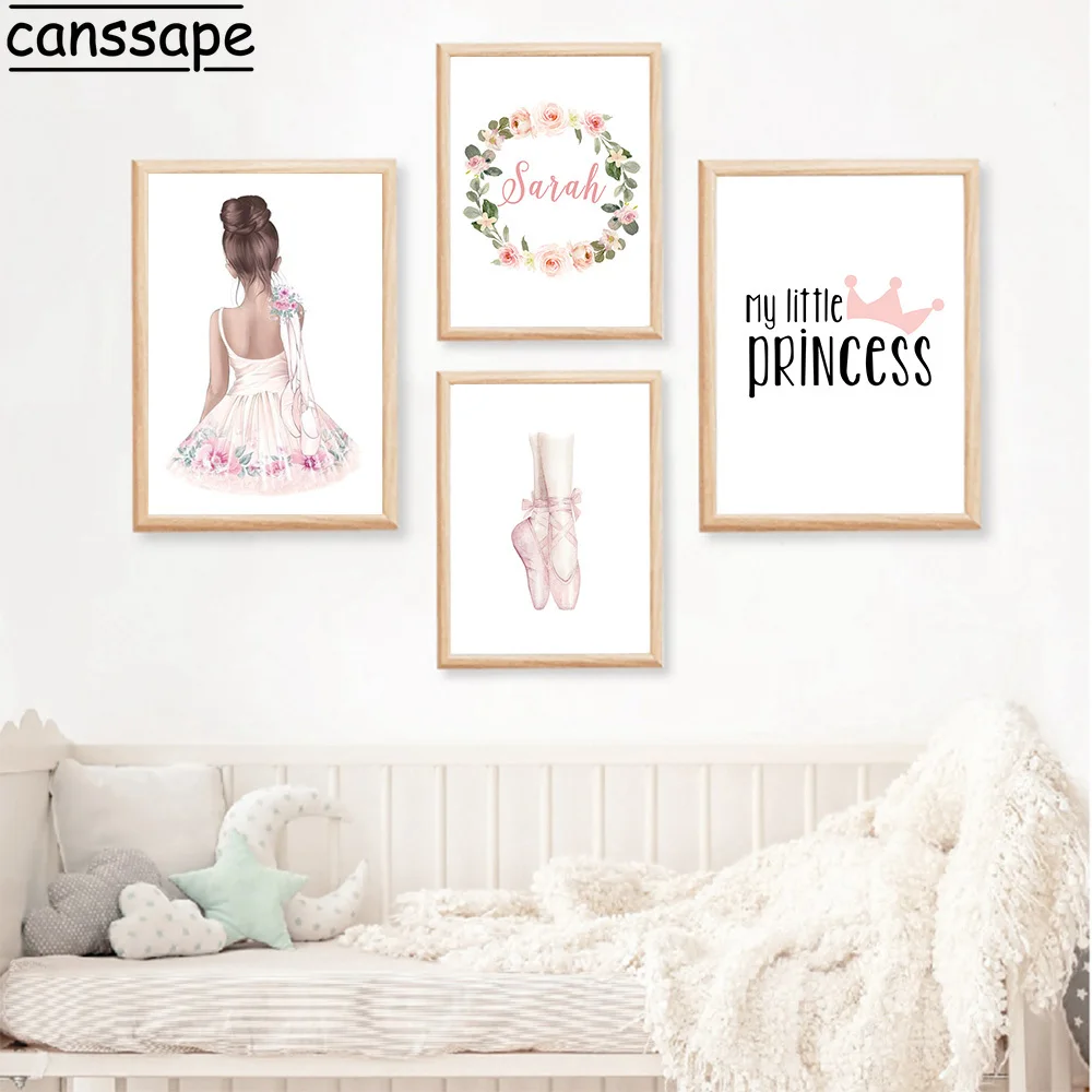 Персонализированная художественная картина с именем на заказ для девочек, Холст, принты, Постер принцессы, балета, цветок, кролик, Настенная картина, декор для детской комнаты