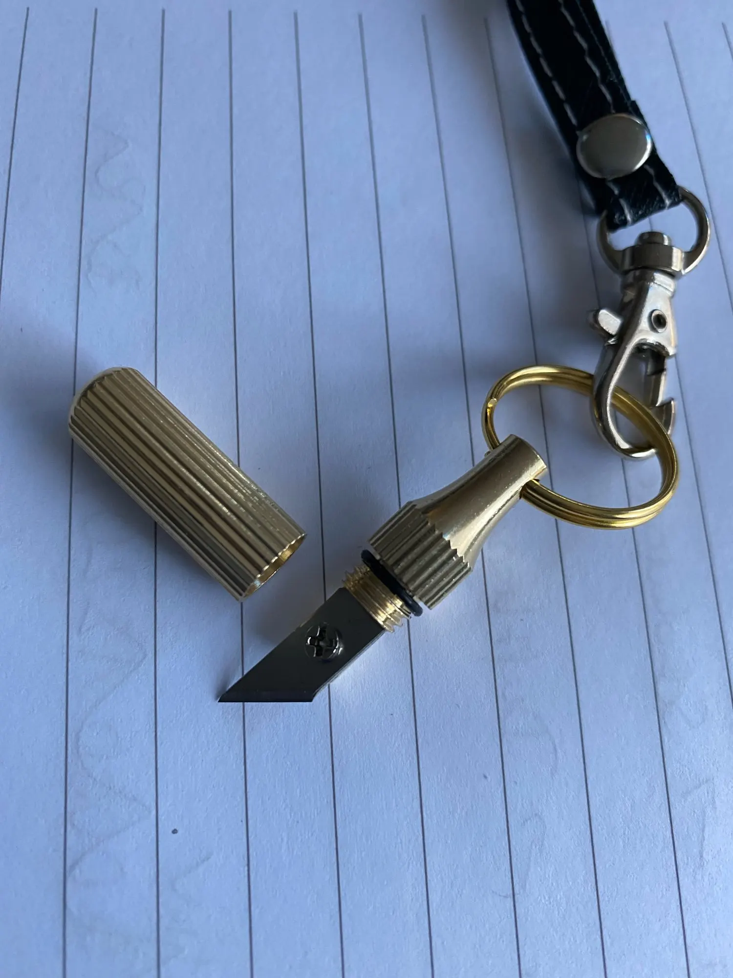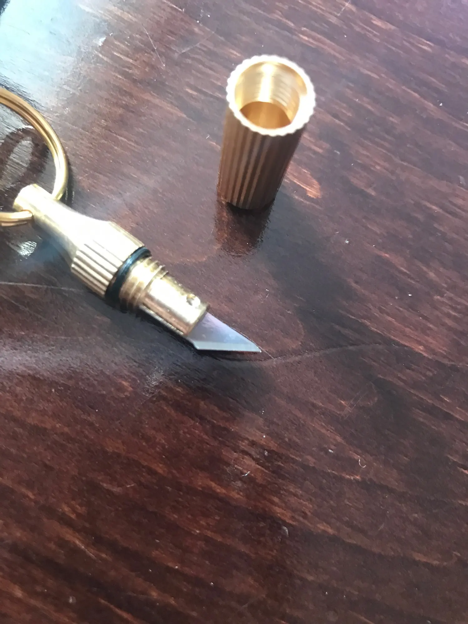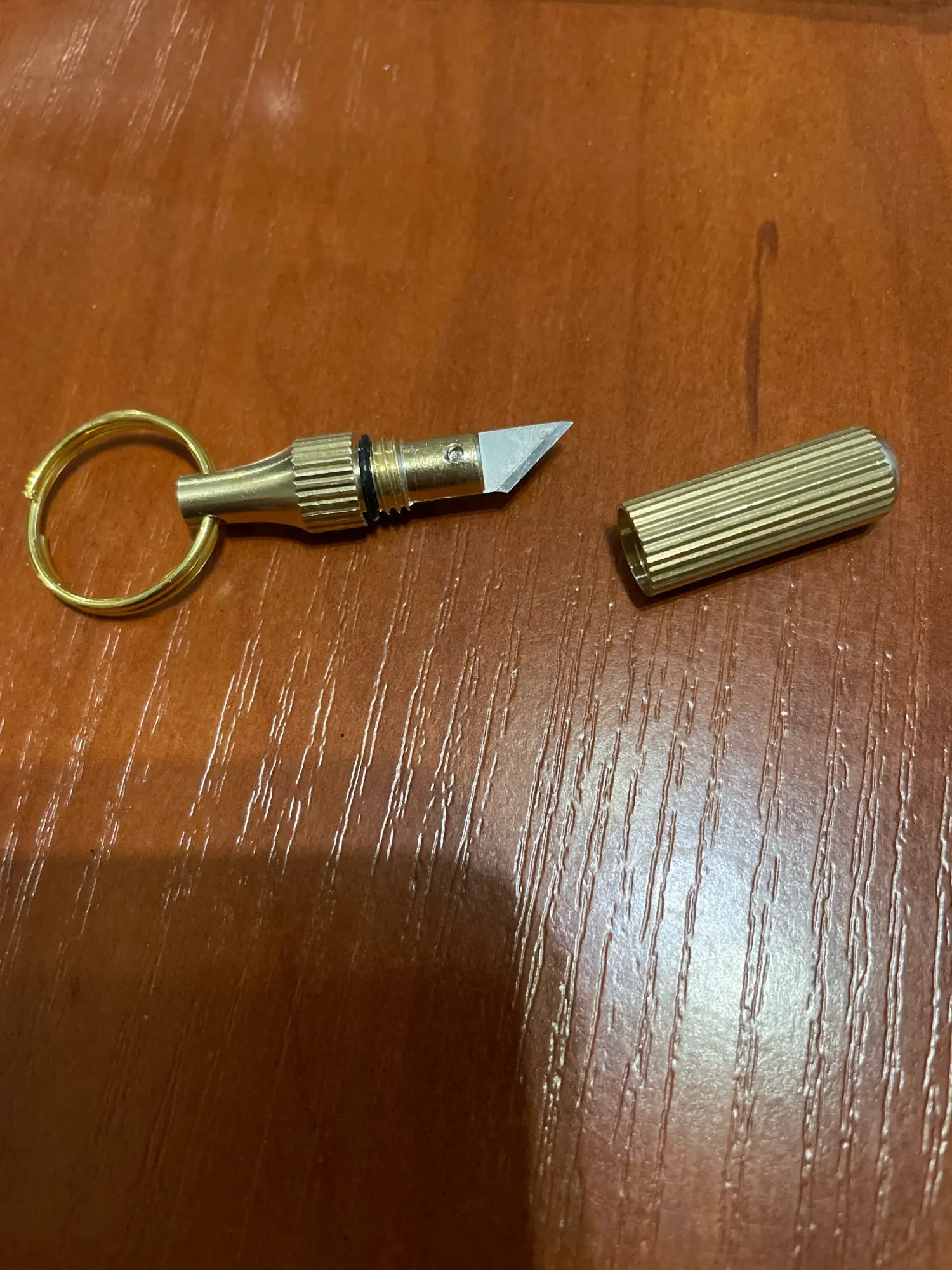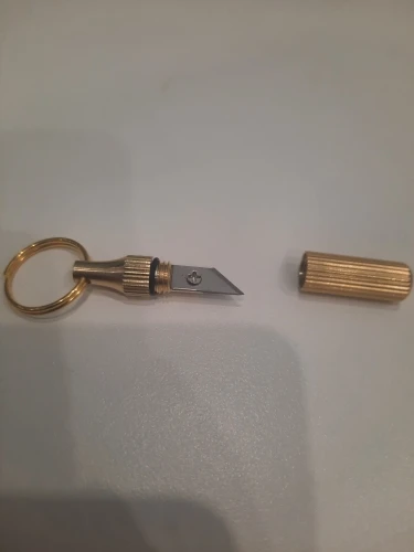 Хороший, полезный брелок. Очень острый. Качество хорошее, со временем можно будет даже подточить. Уронила, воткнулся в стол, кончик не погнулся. Если продавец предложит запасные лезвия, это будет идеально. Доставка месяц.