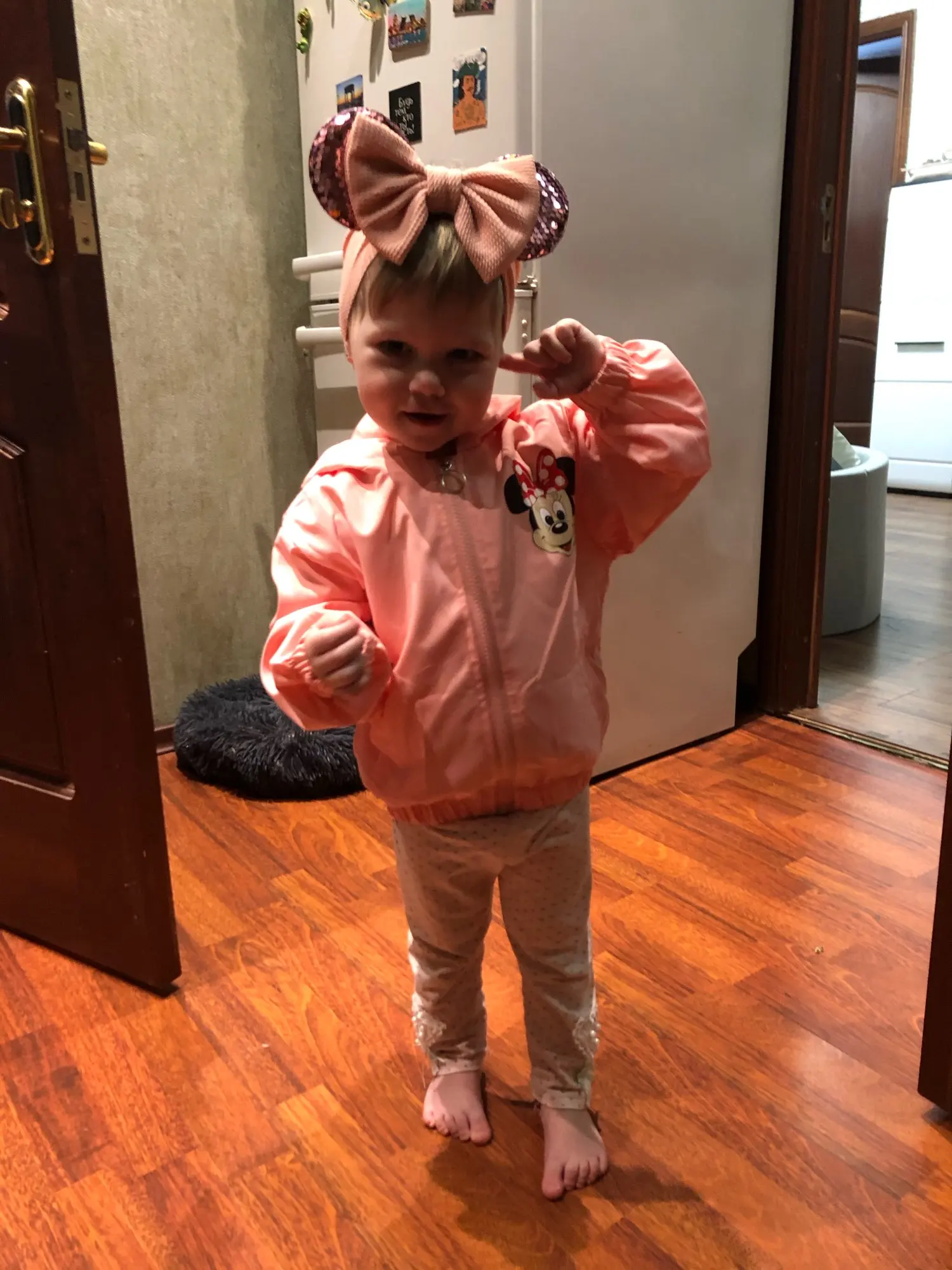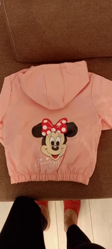 Стоимость с доставкой для данного материала дорогая... Минни наклейка, которая от пары стирок оторвётся. В целом куртка аккуратная, нитки нигде не торчат, запаха не было. Молния качественно прошита. Цвет приятный. На бирке размер 100. На момент фото у дочки рост 86.