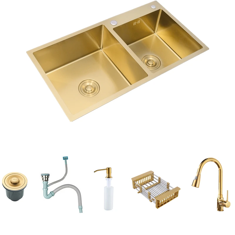 Ручной 2 кухонные чаши раковины с золотым Слива мульти Размеры двойной золотой Кухня Раковина кран SUS 304 Нержавеющаясталь 80x45cm
