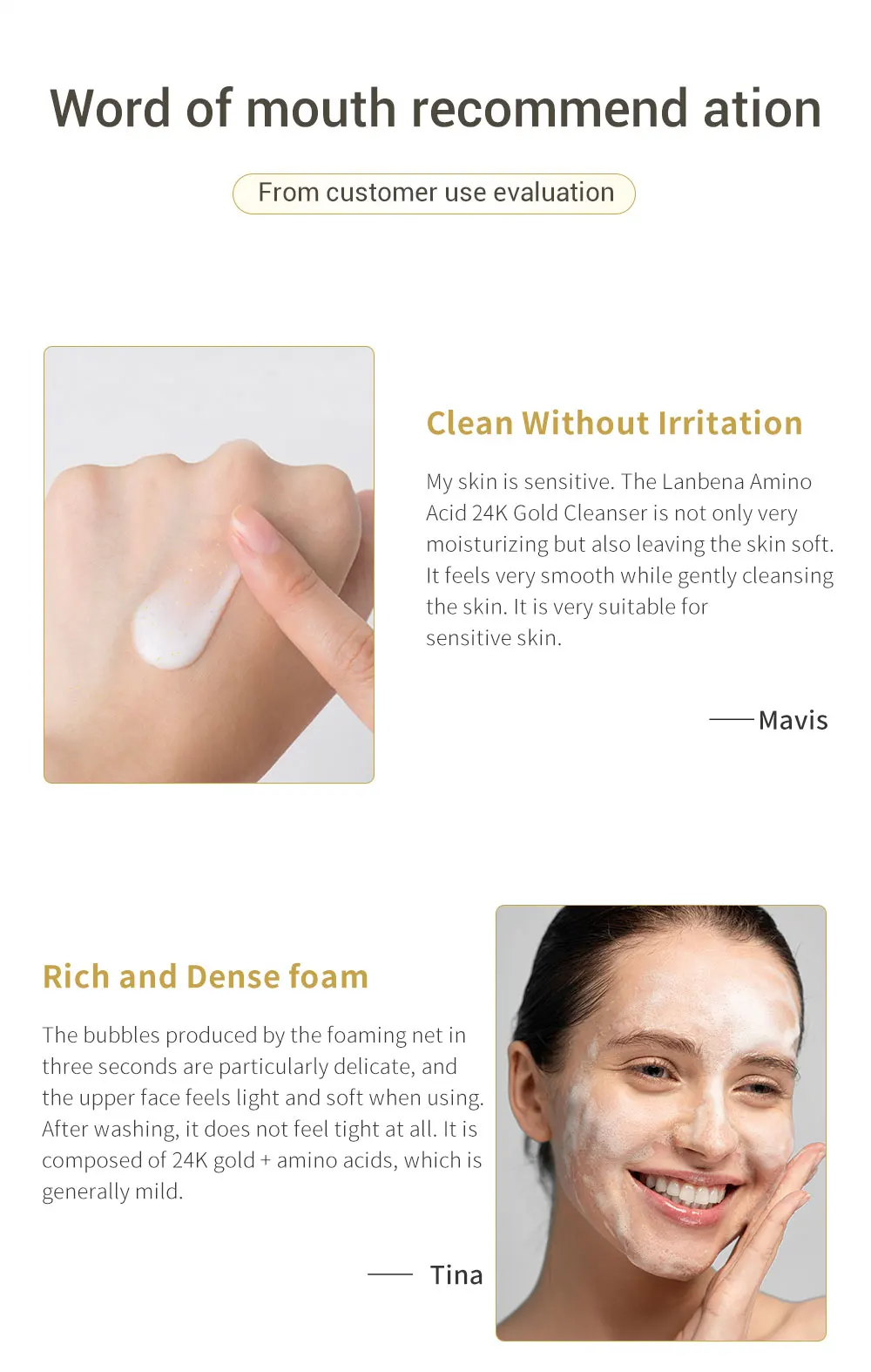 Очистите и удалите макияж в одном, легко удалите светильник и солнцезащитный крем Глубокое очищение пор. Перед удалением макияжа/во время удаления макияжа/после удаления макияжа Очистите без раздражения Моя кожа чувствительна. Очищающее Средство Lanbena Amino Acid 24K Gold не только очень увлажняет, но и делает кожу мягкой. Он очень гладкий, мягко очищает кожу. Очень подходит для чувствительной кожи. --- Mavis Богатая и плотная пена Пузырьки, создаваемые пенящейся сеткой в течение трех секунд, особенно деликатны, а Верхняя поверхность ощущается как светильник, так и мягкий при использовании. После стирки он совсем не ощущается туго. Он состоит из 24K золота + аминокислот, которые, как правило, мягкие.