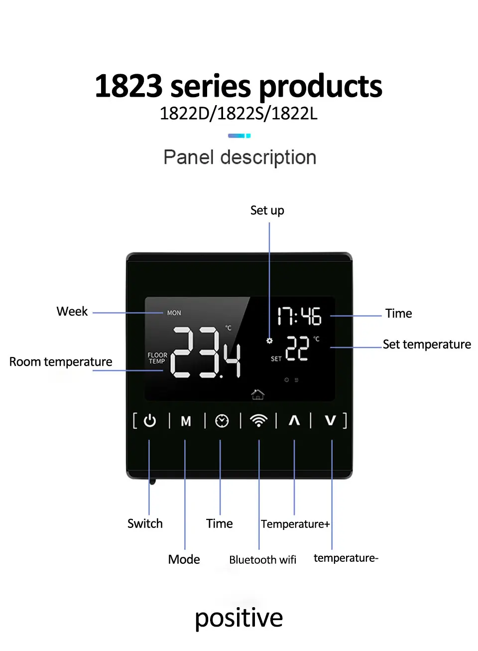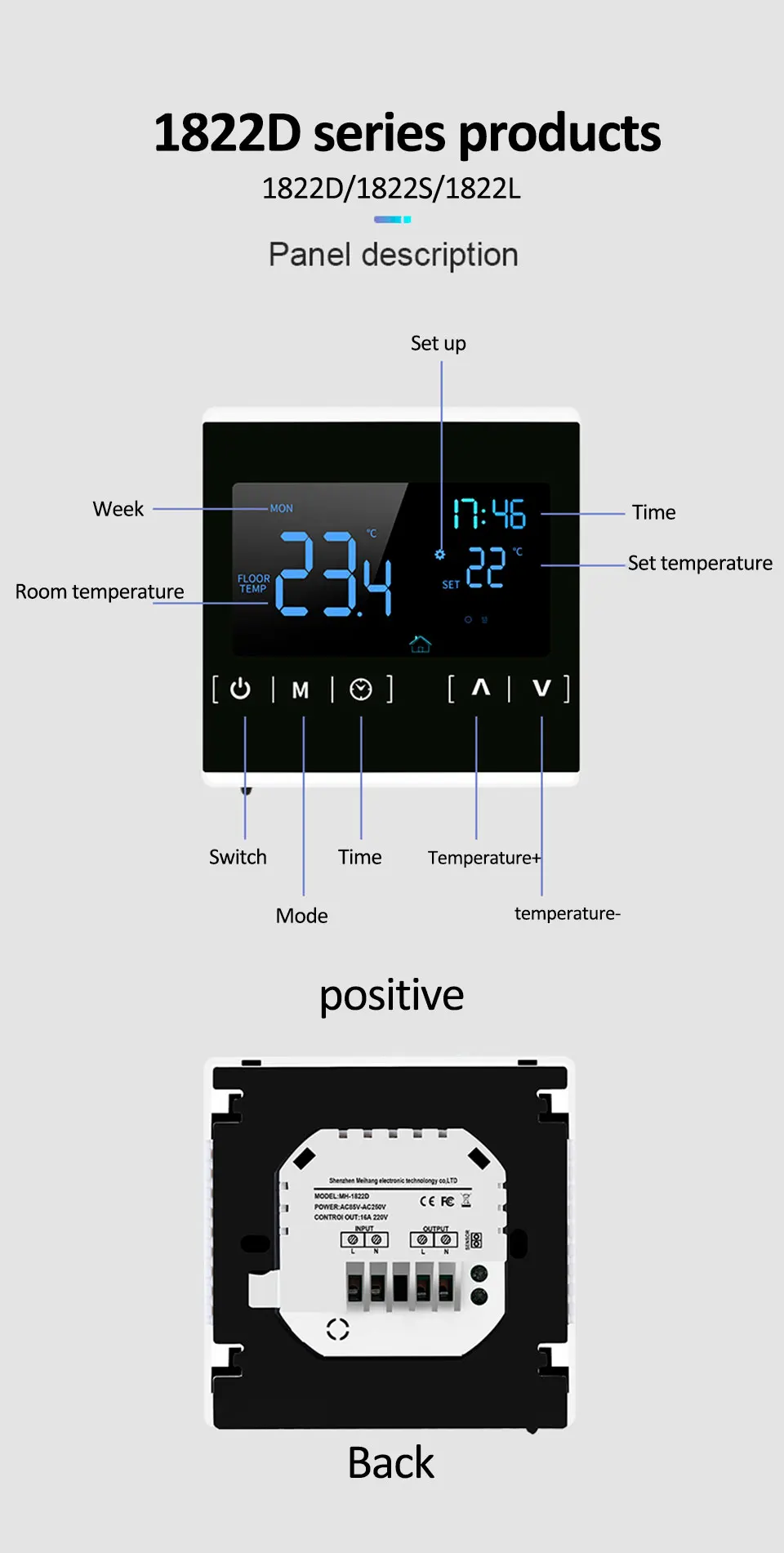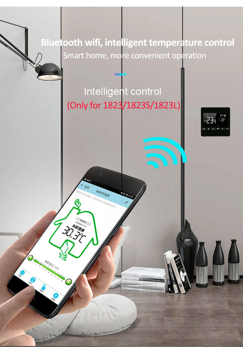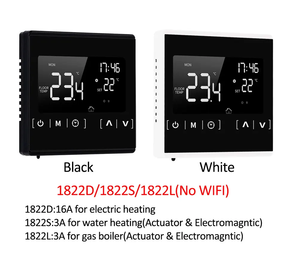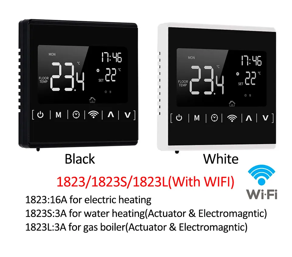 MH1823D WiFi: электрическое Напольное отопление с функцией WiFi, голосовое управление, 16A.MH1823S WiFi: водяное Напольное отопление для управления без привода NC или электромагнитного клапана с функцией WiFi, голосовым управлением, 3A.MH1823L WiFi: газовый котел, водяное Напольное отопление для управления без привода NC или электромагнитного клапана с функцией WiFi, голосовым управлением, 3A.Старый тип:MH1822 тип используется для электрического напольного отопления, например, электрического нагревательного кабеля, электрической нагревательной пленки, электрического нагревательного коврика и других электрических нагревателей.