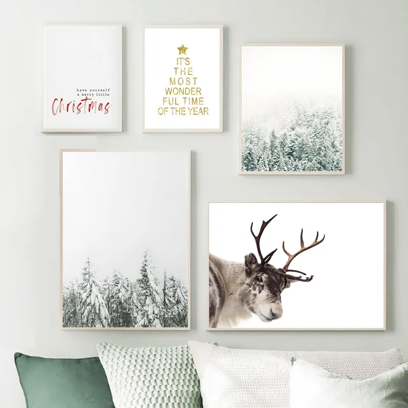 Рождественские картина с оленем природы снегом деревом настенные картины плакат в скандинавском стиле Nordic живопись на холсте Настенный декор