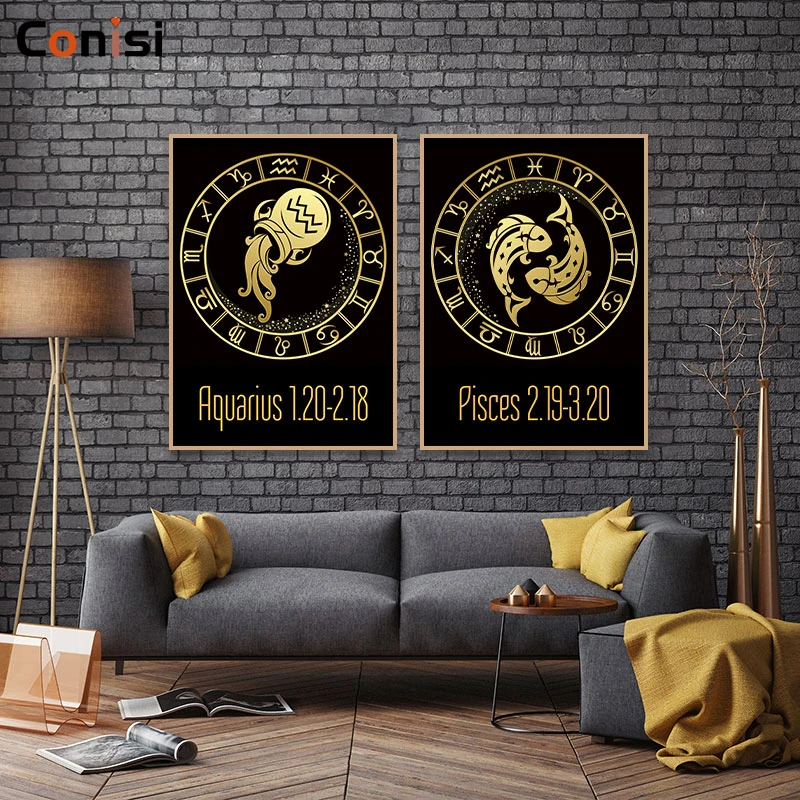 Современная черная Золотая картина Conisi со знаками Зодиака, Постер созвездий, печать на стене, 12 знаков, домашний декор для спальни