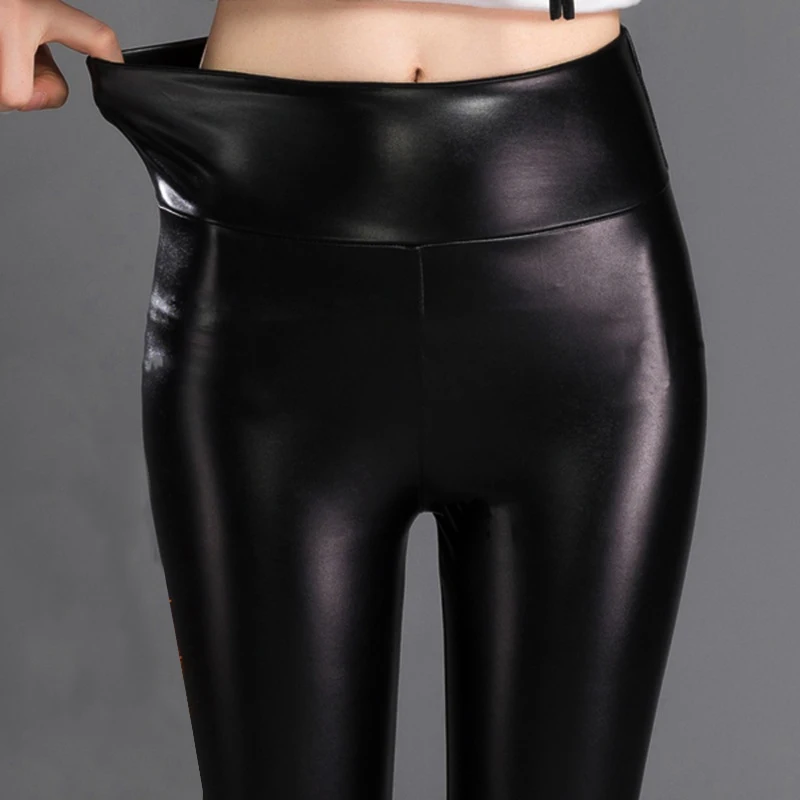 Женские зимние кожаные брюки, черные облегающие леггинсы с высокой ...