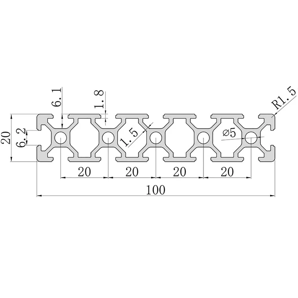 Материал: алюминиевый сплав 6063-T5 Цвет: серебристо-белый Размер: 20*100 мм Толщина стенок: 1,5 мм Вес: 1,87 кг/мДлина: 100-1000 мм (опционально)