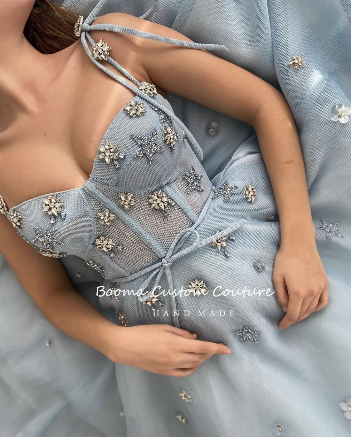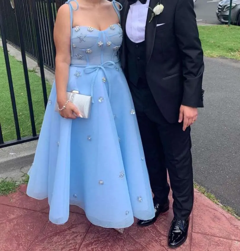 Сетчатые тюлевые платья для выпускного вечера Booma, детские синие платья-трапеции на тонких бретелях, Короткие вечерние платья до середины икры со стразами